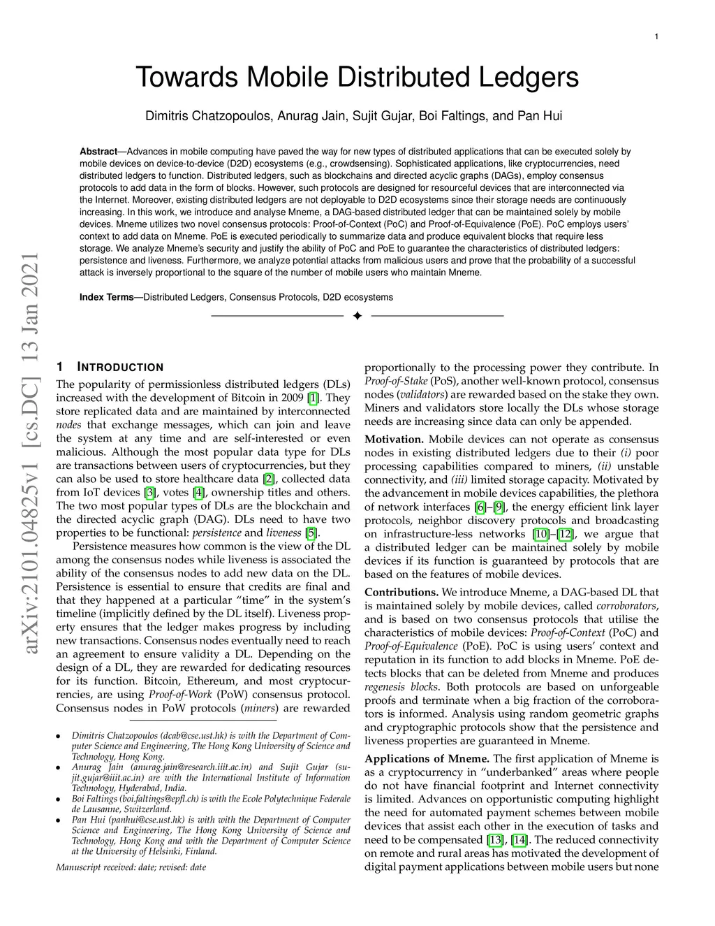 Advances in mobile computing have paved the way for new types of distributed applications that can be executed solely by mobile devices on device-to-device (D2D) ecosystems (e.g., crowdsensing). Sophisticated applications, like cryptocurrencies, need distributed ledgers to function. Distributed ledgers, such as blockchains and directed acyclic graphs (DAGs), employ consensus protocols to add data in the form of blocks. However, such protocols are designed for resourceful devices that are interconnected via the Internet. Moreover, existing distributed ledgers are not deployable to D2D ecosystems since their storage needs are continuously increasing. In this work, we introduce and analyse Mneme, a DAG-based distributed ledger that can be maintained solely by mobile devices. Mneme utilizes two novel consensus protocols: Proof-of-Context (PoC) and Proof-of-Equivalence (PoE). PoC employs users' context to add data on Mneme. PoE is executed periodically to summarize data and produce equivalent blocks that require less storage. We analyze Mneme's security and justify the ability of PoC and PoE to guarantee the characteristics of distributed ledgers: persistence and liveness. Furthermore, we analyze potential attacks from malicious users and prove that the probability of a successful attack is inversely proportional to the square of the number of mobile users who maintain Mneme.