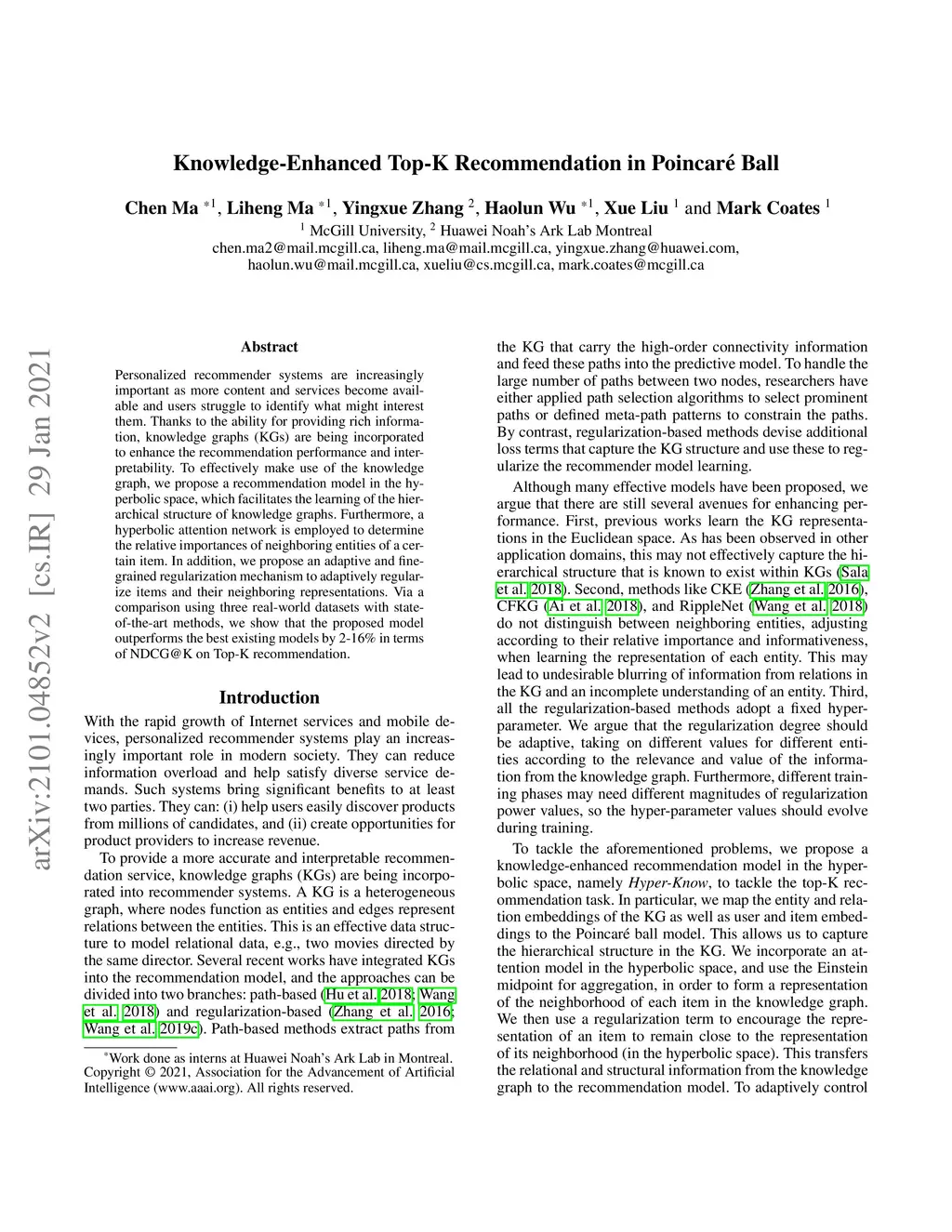 Knowledge-Enhanced Top-K Recommendation in Poincaré Ball