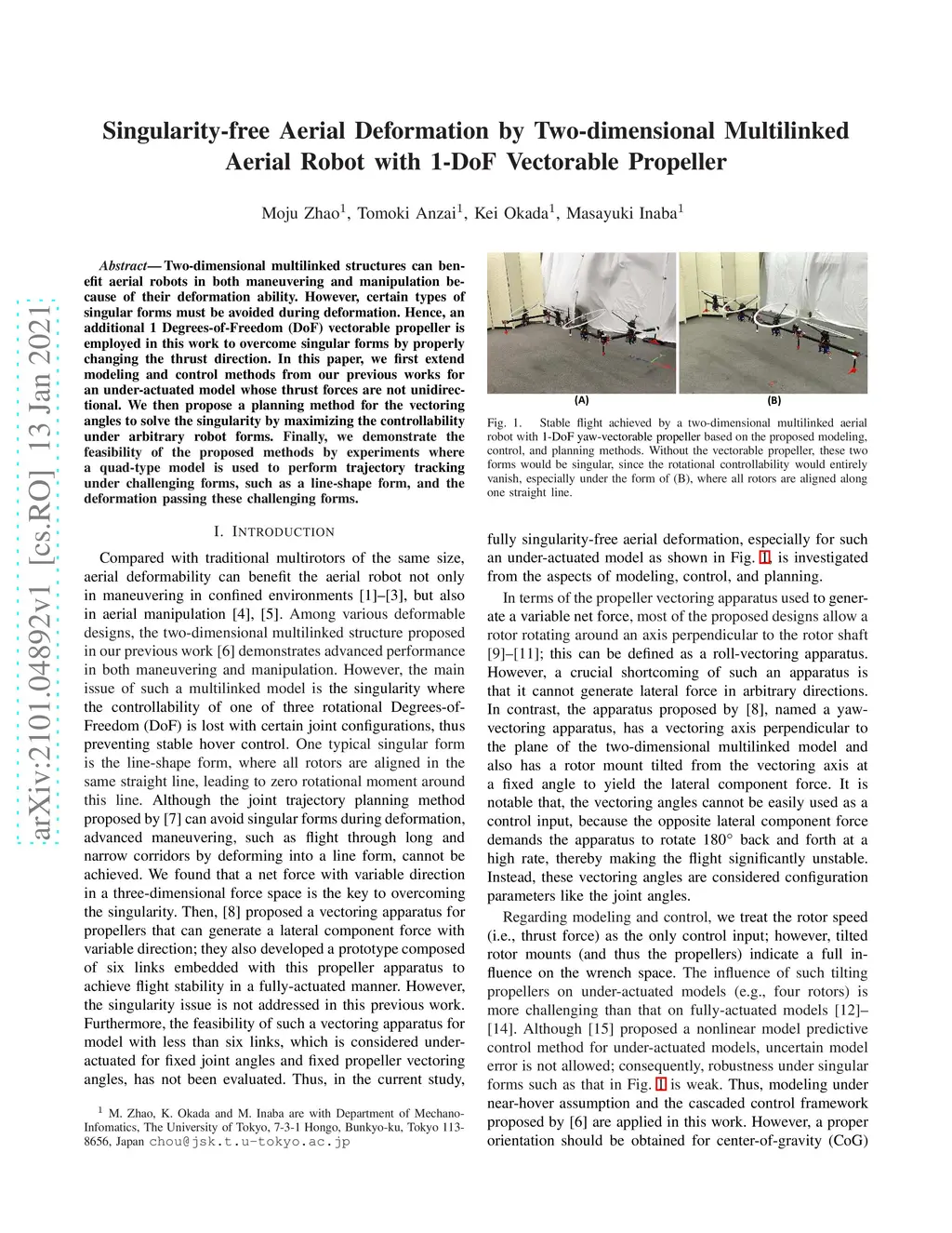 Two-dimensional multilinked structures can benefit aerial robots in both maneuvering and manipulation because of their deformation ability. However, certain types of singular forms must be avoided during deformation. Hence, an additional 1 Degrees-of-Freedom (DoF) vectorable propeller is employed in this work to overcome singular forms by properly changing the thrust direction. In this paper, we first extend modeling and control methods from our previous works for an under-actuated model whose thrust forces are not unidirectional. We then propose a planning method for the vectoring angles to solve the singularity by maximizing the controllability under arbitrary robot forms. Finally, we demonstrate the feasibility of the proposed methods by experiments where a quad-type model is used to perform trajectory tracking under challenging forms, such as a line-shape form, and the deformation passing these challenging forms.