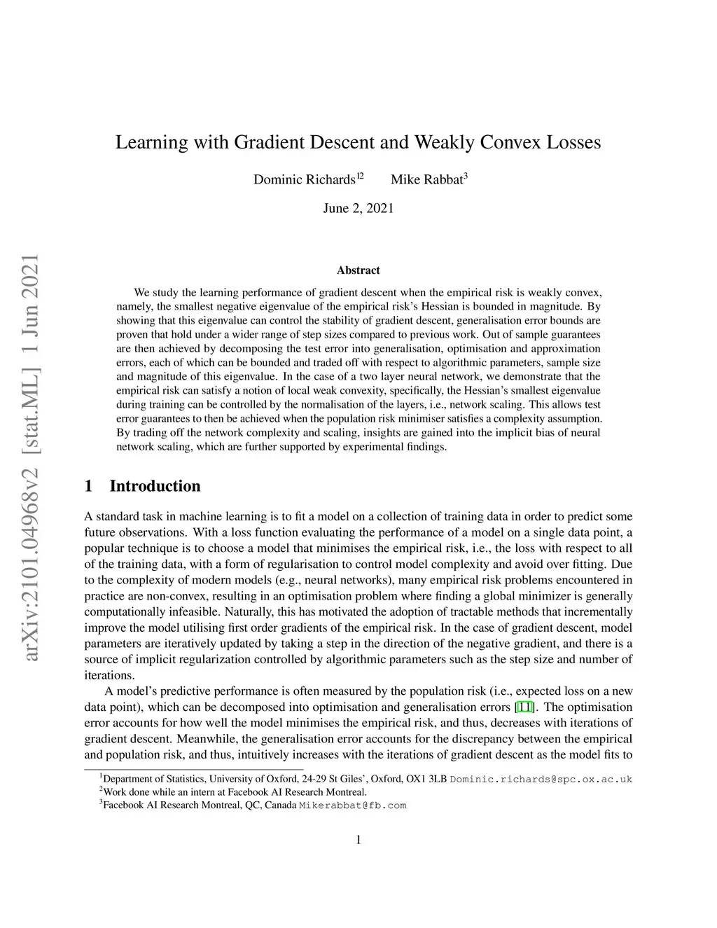 We study the learning performance of gradient descent when the empirical risk is weakly convex, namely, the smallest negative eigenvalue of the empirical risk's Hessian is bounded in magnitude. By showing that this eigenvalue can control the stability of gradient descent, generalisation error bounds are proven that hold under a wider range of step sizes compared to previous work. Out of sample guarantees are then achieved by decomposing the test error into generalisation, optimisation and approximation errors, each of which can be bounded and traded off with respect to algorithmic parameters, sample size and magnitude of this eigenvalue. In the case of a two layer neural network, we demonstrate that the empirical risk can satisfy a notion of local weak convexity, specifically, the Hessian's smallest eigenvalue during training can be controlled by the normalisation of the layers, i.e., network scaling. This allows test error guarantees to then be achieved when the population risk minimiser satisfies a complexity assumption. By trading off the network complexity and scaling, insights are gained into the implicit bias of neural network scaling, which are further supported by experimental findings.