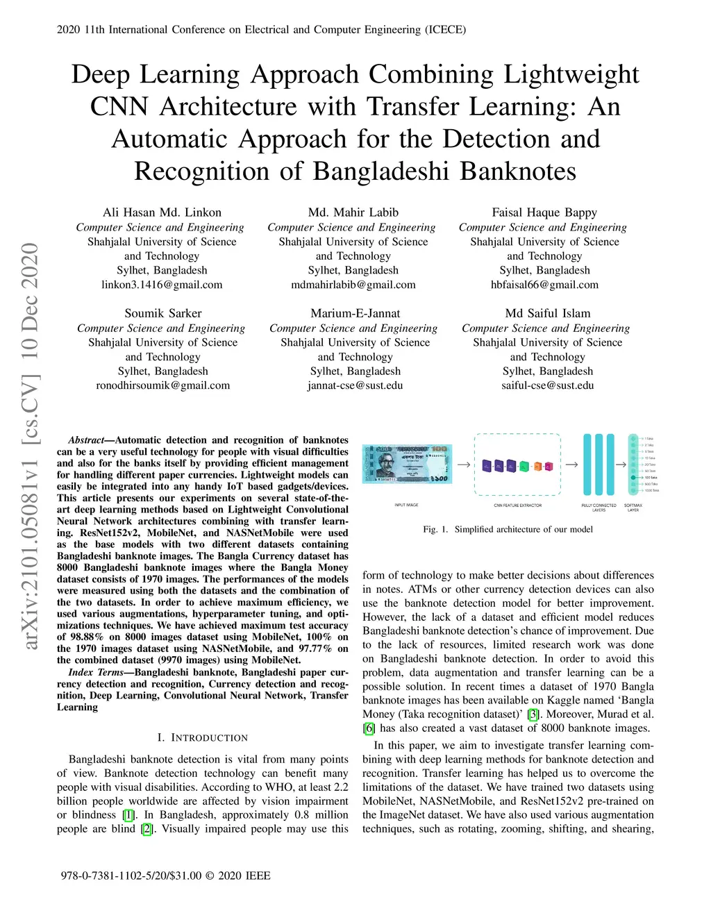 Automatic detection and recognition of banknotes can be a very useful technology for people with visual difficulties and also for the banks itself by providing efficient management for handling different paper currencies. Lightweight models can easily be integrated into any handy IoT based gadgets/devices. This article presents our experiments on several state-of-the-art deep learning methods based on Lightweight Convolutional Neural Network architectures combining with transfer learning. ResNet152v2, MobileNet, and NASNetMobile were used as the base models with two different datasets containing Bangladeshi banknote images. The Bangla Currency dataset has 8000 Bangladeshi banknote images where the Bangla Money dataset consists of 1970 images. The performances of the models were measured using both the datasets and the combination of the two datasets. In order to achieve maximum efficiency, we used various augmentations, hyperparameter tuning, and optimizations techniques. We have achieved maximum test accuracy of 98.88\% on 8000 images dataset using MobileNet, 100\% on the 1970 images dataset using NASNetMobile, and 97.77\% on the combined dataset (9970 images) using MobileNet.