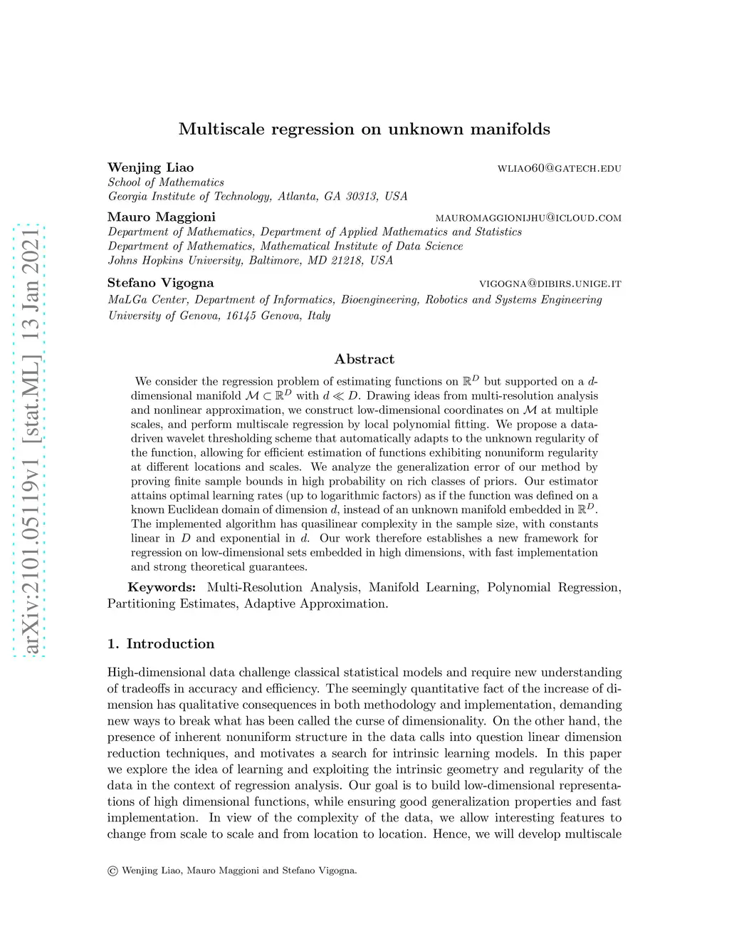 We consider the regression problem of estimating functions on but supported on a -dimensional manifold $ \mathcal{M} \subset \mathbb{R}^D $ with $ d \ll D $. Drawing ideas from multi-resolution analysis and nonlinear approximation, we construct low-dimensional coordinates on at multiple scales, and perform multiscale regression by local polynomial fitting. We propose a data-driven wavelet thresholding scheme that automatically adapts to the unknown regularity of the function, allowing for efficient estimation of functions exhibiting nonuniform regularity at different locations and scales. We analyze the generalization error of our method by proving finite sample bounds in high probability on rich classes of priors. Our estimator attains optimal learning rates (up to logarithmic factors) as if the function was defined on a known Euclidean domain of dimension , instead of an unknown manifold embedded in . The implemented algorithm has quasilinear complexity in the sample size, with constants linear in and exponential in . Our work therefore establishes a new framework for regression on low-dimensional sets embedded in high dimensions, with fast implementation and strong theoretical guarantees.