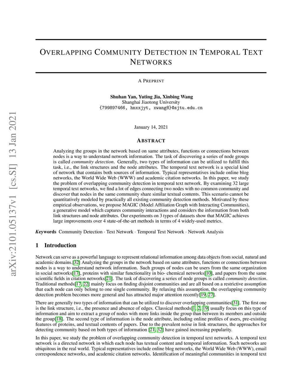 Analyzing the groups in the network based on same attributes, functions or connections between nodes is a way to understand network information. The task of discovering a series of node groups is called community detection. Generally, two types of information can be utilized to fulfill this task, i.e., the link structures and the node attributes. The temporal text network is a special kind of network that contains both sources of information. Typical representatives include online blog networks, the World Wide Web (WWW) and academic citation networks. In this paper, we study the problem of overlapping community detection in temporal text network. By examining 32 large temporal text networks, we find a lot of edges connecting two nodes with no common community and discover that nodes in the same community share similar textual contents. This scenario cannot be quantitatively modeled by practically all existing community detection methods. Motivated by these empirical observations, we propose MAGIC (Model Affiliation Graph with Interacting Communities), a generative model which captures community interactions and considers the information from both link structures and node attributes. Our experiments on 3 types of datasets show that MAGIC achieves large improvements over 4 state-of-the-art methods in terms of 4 widely-used metrics.