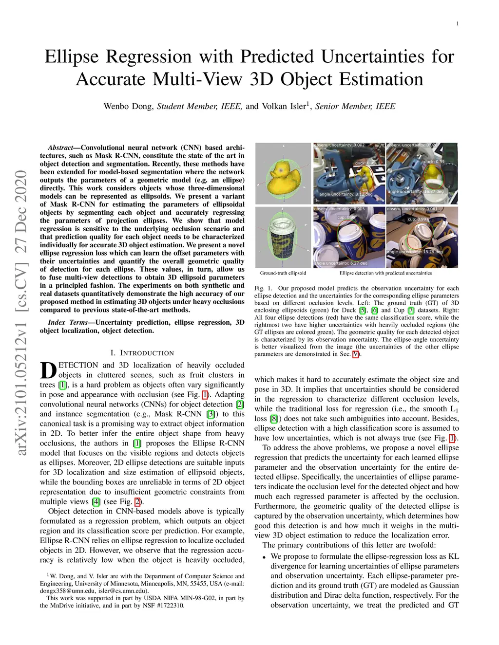 Convolutional neural network (CNN) based architectures, such as Mask R-CNN, constitute the state of the art in object detection and segmentation. Recently, these methods have been extended for model-based segmentation where the network outputs the parameters of a geometric model (e.g. an ellipse) directly. This work considers objects whose three-dimensional models can be represented as ellipsoids. We present a variant of Mask R-CNN for estimating the parameters of ellipsoidal objects by segmenting each object and accurately regressing the parameters of projection ellipses. We show that model regression is sensitive to the underlying occlusion scenario and that prediction quality for each object needs to be characterized individually for accurate 3D object estimation. We present a novel ellipse regression loss which can learn the offset parameters with their uncertainties and quantify the overall geometric quality of detection for each ellipse. These values, in turn, allow us to fuse multi-view detections to obtain 3D ellipsoid parameters in a principled fashion. The experiments on both synthetic and real datasets quantitatively demonstrate the high accuracy of our proposed method in estimating 3D objects under heavy occlusions compared to previous state-of-the-art methods.