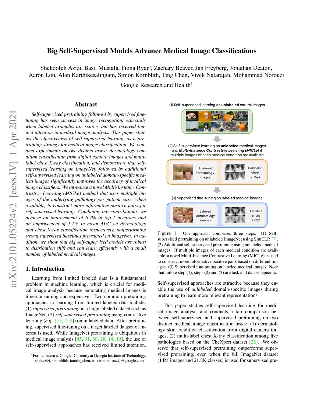 Self-supervised pretraining followed by supervised fine-tuning has seen success in image recognition, especially when labeled examples are scarce, but has received limited attention in medical image analysis. This paper studies the effectiveness of self-supervised learning as a pretraining strategy for medical image classification. We conduct experiments on two distinct tasks: dermatology skin condition classification from digital camera images and multi-label chest X-ray classification, and demonstrate that self-supervised learning on ImageNet, followed by additional self-supervised learning on unlabeled domain-specific medical images significantly improves the accuracy of medical image classifiers. We introduce a novel Multi-Instance Contrastive Learning (MICLe) method that uses multiple images of the underlying pathology per patient case, when available, to construct more informative positive pairs for self-supervised learning. Combining our contributions, we achieve an improvement of 6.7% in top-1 accuracy and an improvement of 1.1% in mean AUC on dermatology and chest X-ray classification respectively, outperforming strong supervised baselines pretrained on ImageNet. In addition, we show that big self-supervised models are robust to distribution shift and can learn efficiently with a small number of labeled medical images.