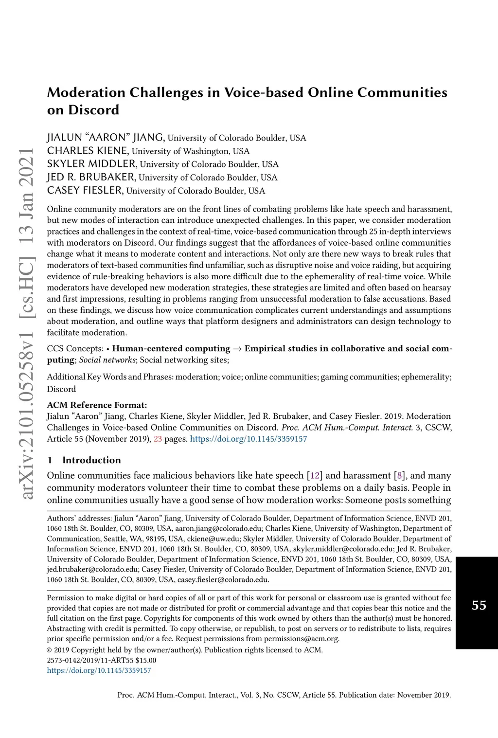 Online community moderators are on the front lines of combating problems like hate speech and harassment, but new modes of interaction can introduce unexpected challenges. In this paper, we consider moderation practices and challenges in the context of real-time, voice-based communication through 25 in-depth interviews with moderators on Discord. Our findings suggest that the affordances of voice-based online communities change what it means to moderate content and interactions. Not only are there new ways to break rules that moderators of text-based communities find unfamiliar, such as disruptive noise and voice raiding, but acquiring evidence of rule-breaking behaviors is also more difficult due to the ephemerality of real-time voice. While moderators have developed new moderation strategies, these strategies are limited and often based on hearsay and first impressions, resulting in problems ranging from unsuccessful moderation to false accusations. Based on these findings, we discuss how voice communication complicates current understandings and assumptions about moderation, and outline ways that platform designers and administrators can design technology to facilitate moderation.