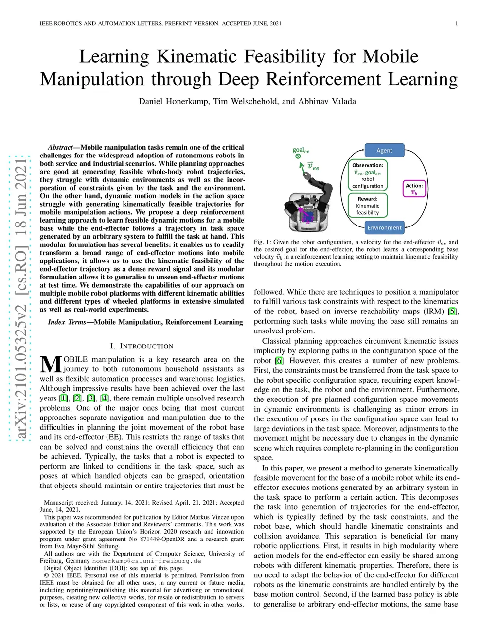 Mobile manipulation tasks remain one of the critical challenges for the widespread adoption of autonomous robots in both service and industrial scenarios. While planning approaches are good at generating feasible whole-body robot trajectories, they struggle with dynamic environments as well as the incorporation of constraints given by the task and the environment. On the other hand, dynamic motion models in the action space struggle with generating kinematically feasible trajectories for mobile manipulation actions. We propose a deep reinforcement learning approach to learn feasible dynamic motions for a mobile base while the end-effector follows a trajectory in task space generated by an arbitrary system to fulfill the task at hand. This modular formulation has several benefits: it enables us to readily transform a broad range of end-effector motions into mobile applications, it allows us to use the kinematic feasibility of the end-effector trajectory as a dense reward signal and its modular formulation allows it to generalise to unseen end-effector motions at test time. We demonstrate the capabilities of our approach on multiple mobile robot platforms with different kinematic abilities and different types of wheeled platforms in extensive simulated as well as real-world experiments.