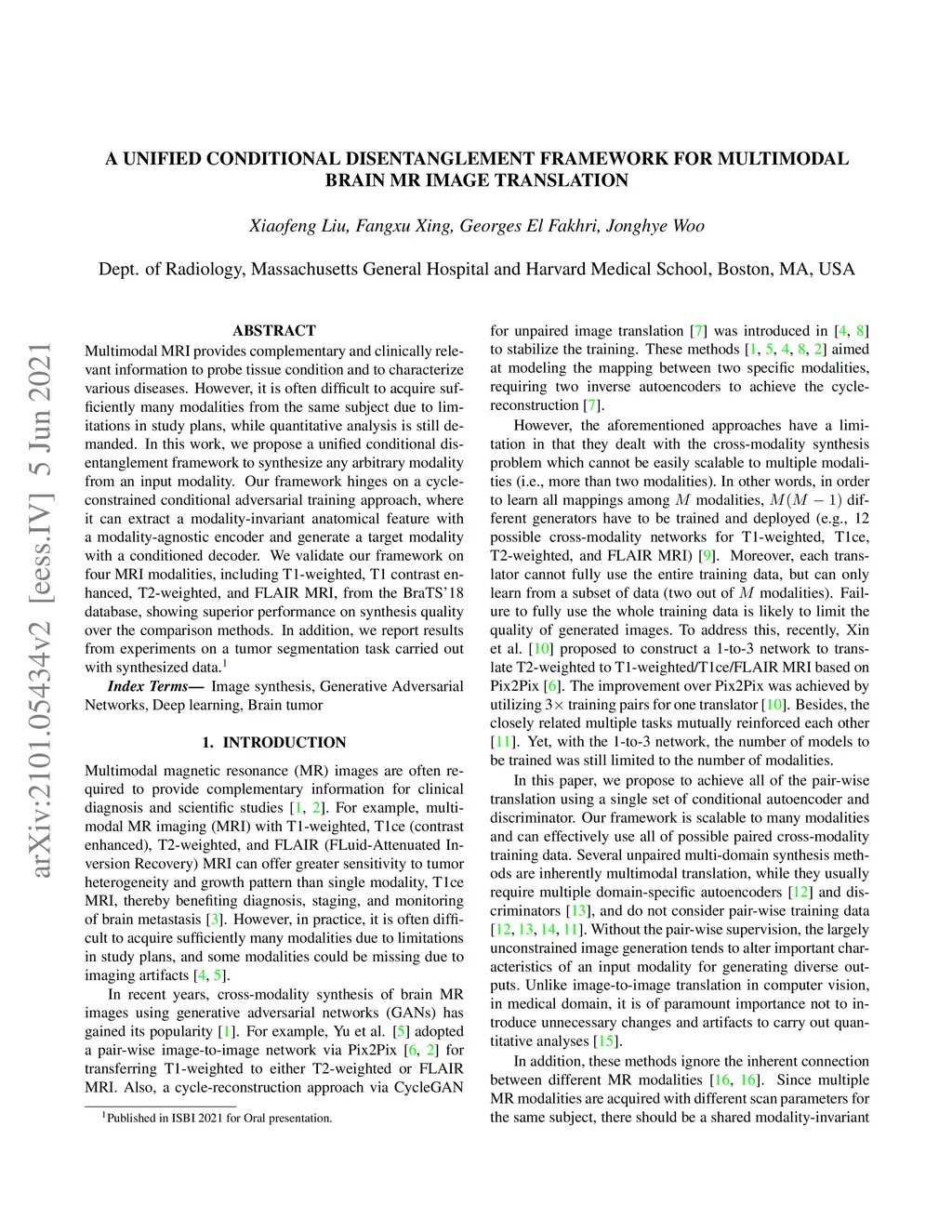 Multimodal MRI provides complementary and clinically relevant information to probe tissue condition and to characterize various diseases. However, it is often difficult to acquire sufficiently many modalities from the same subject due to limitations in study plans, while quantitative analysis is still demanded. In this work, we propose a unified conditional disentanglement framework to synthesize any arbitrary modality from an input modality. Our framework hinges on a cycle-constrained conditional adversarial training approach, where it can extract a modality-invariant anatomical feature with a modality-agnostic encoder and generate a target modality with a conditioned decoder. We validate our framework on four MRI modalities, including T1-weighted, T1 contrast enhanced, T2-weighted, and FLAIR MRI, from the BraTS'18 database, showing superior performance on synthesis quality over the comparison methods. In addition, we report results from experiments on a tumor segmentation task carried out with synthesized data.