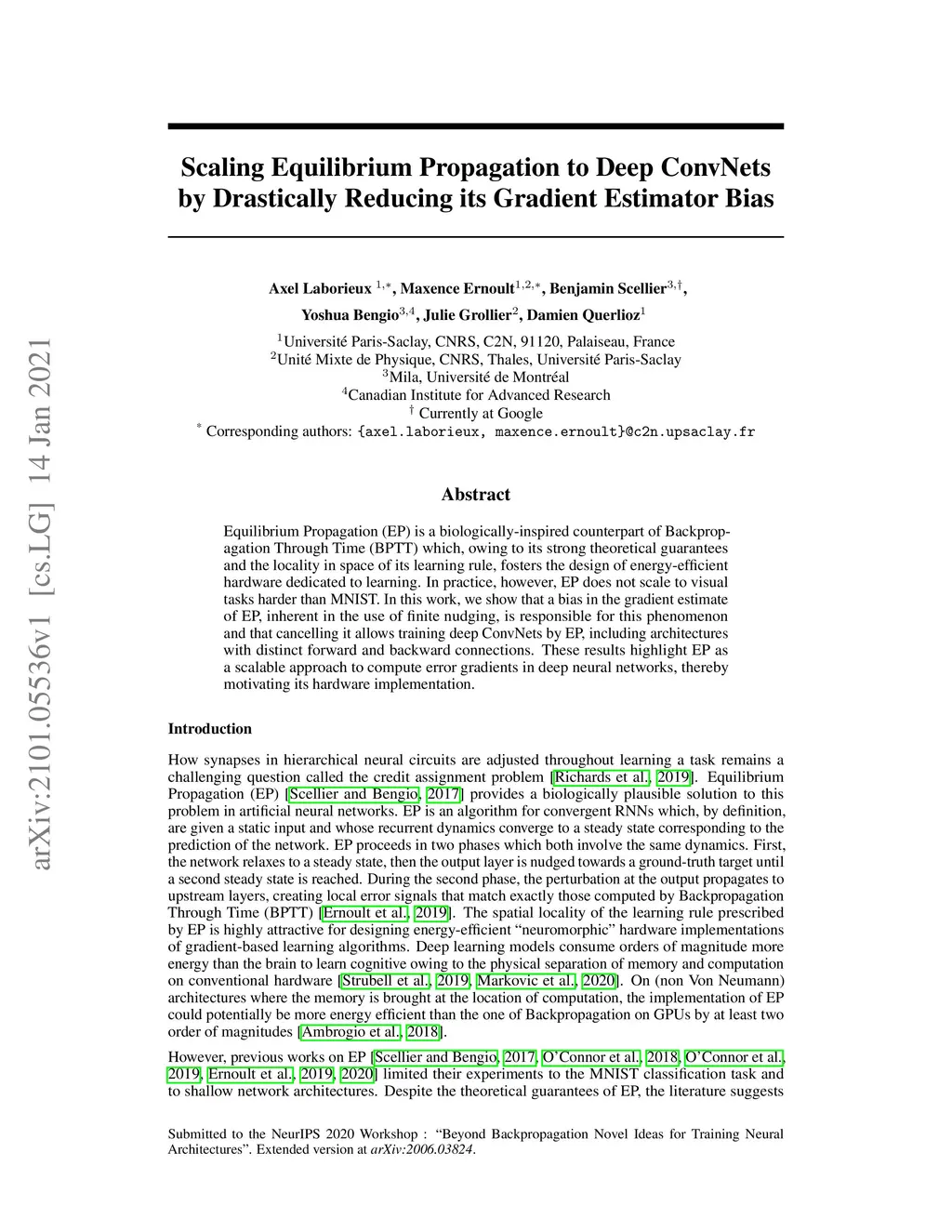 Equilibrium Propagation (EP) is a biologically-inspired counterpart of Backpropagation Through Time (BPTT) which, owing to its strong theoretical guarantees and the locality in space of its learning rule, fosters the design of energy-efficient hardware dedicated to learning. In practice, however, EP does not scale to visual tasks harder than MNIST. In this work, we show that a bias in the gradient estimate of EP, inherent in the use of finite nudging, is responsible for this phenomenon and that cancelling it allows training deep ConvNets by EP, including architectures with distinct forward and backward connections. These results highlight EP as a scalable approach to compute error gradients in deep neural networks, thereby motivating its hardware implementation.