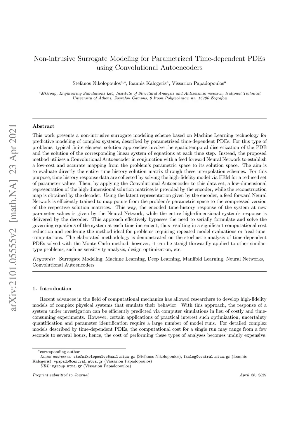 This work presents a non-intrusive surrogate modeling scheme based on machine learning technology for predictive modeling of complex systems, described by parametrized time-dependent PDEs. For these problems, typical finite element approaches involve the spatiotemporal discretization of the PDE and the solution of the corresponding linear system of equations at each time step. Instead, the proposed method utilizes a convolutional autoencoder in conjunction with a feed forward neural network to establish a low-cost and accurate mapping from the problem's parametric space to its solution space. For this purpose, time history response data are collected by solving the high-fidelity model via FEM for a reduced set of parameter values. Then, by applying the convolutional autoencoder to this data set, a low-dimensional representation of the high-dimensional solution matrices is provided by the encoder, while the reconstruction map is obtained by the decoder. Using the latent representation given by the encoder, a feed-forward neural network is efficiently trained to map points from the problem's parametric space to the compressed version of the respective solution matrices. This way, the encoded response of the system at new parameter values is given by the neural network, while the entire response is delivered by the decoder. This approach effectively bypasses the need to serially formulate and solve the system's governing equations at each time increment, thus resulting in a significant cost reduction and rendering the method ideal for problems requiring repeated model evaluations or 'real-time' computations. The elaborated methodology is demonstrated on the stochastic analysis of time-dependent PDEs solved with the Monte Carlo method, however, it can be straightforwardly applied to other similar-type problems, such as sensitivity analysis, design optimization, etc.
