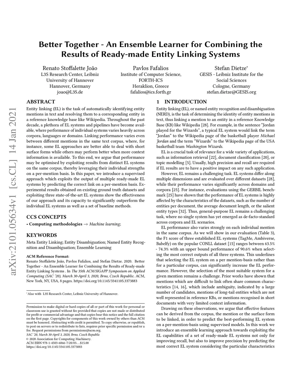 Entity linking (EL) is the task of automatically identifying entity mentions in text and resolving them to a corresponding entity in a reference knowledge base like Wikipedia. Throughout the past decade, a plethora of EL systems and pipelines have become available, where performance of individual systems varies heavily across corpora, languages or domains. Linking performance varies even between different mentions in the same text corpus, where, for instance, some EL approaches are better able to deal with short surface forms while others may perform better when more context information is available. To this end, we argue that performance may be optimised by exploiting results from distinct EL systems on the same corpus, thereby leveraging their individual strengths on a per-mention basis. In this paper, we introduce a supervised approach which exploits the output of multiple ready-made EL systems by predicting the correct link on a per-mention basis. Experimental results obtained on existing ground truth datasets and exploiting three state-of-the-art EL systems show the effectiveness of our approach and its capacity to significantly outperform the individual EL systems as well as a set of baseline methods.