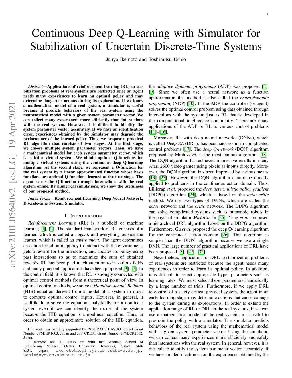 Continuous Deep Q-Learning with Simulator for Stabilization of Uncertain