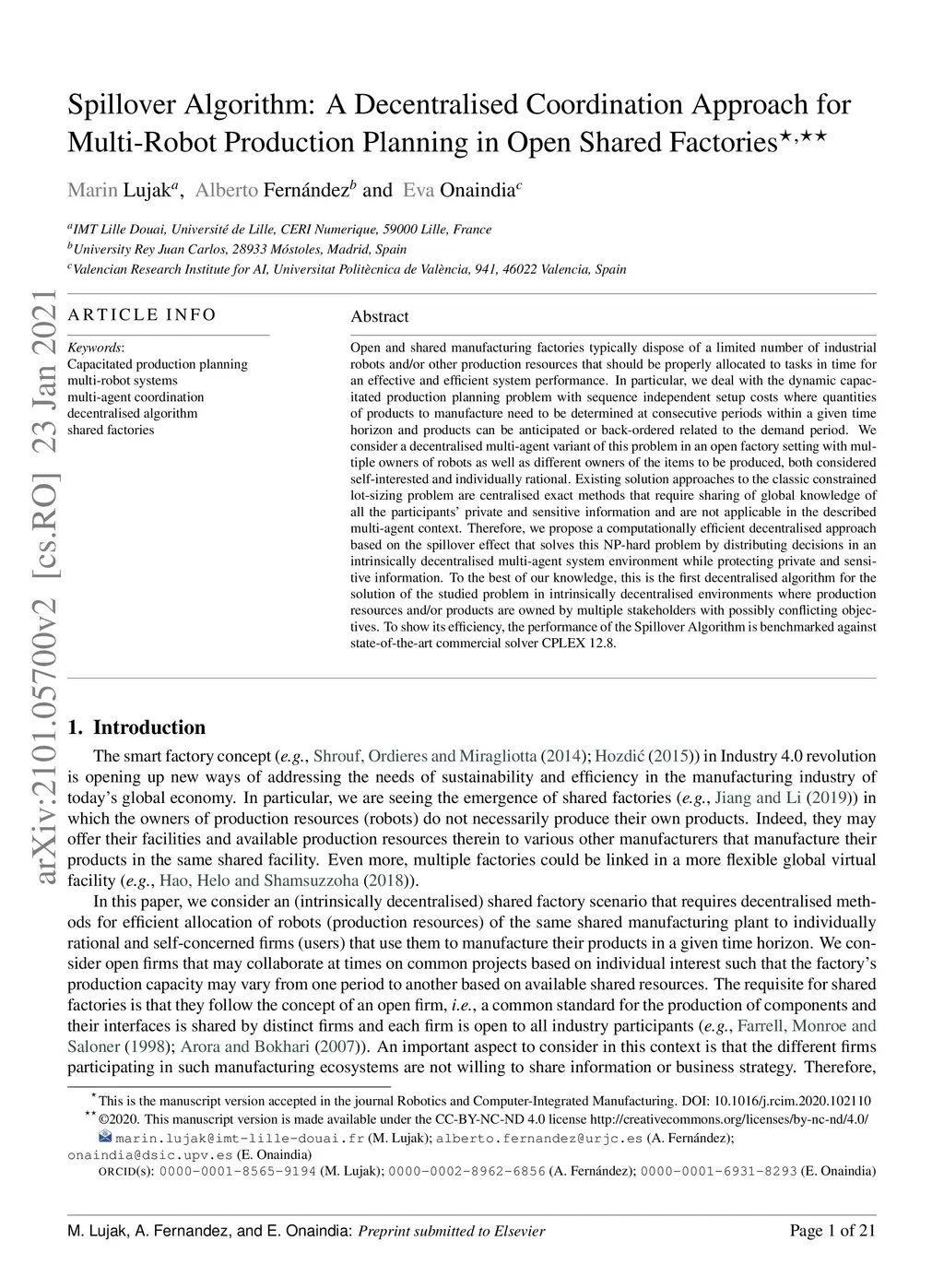 Open and shared manufacturing factories typically dispose of a limited number of robots that should be properly allocated to tasks in time and space for an effective and efficient system performance. In particular, we deal with the dynamic capacitated production planning problem with sequence independent setup costs where quantities of products to manufacture and location of robots need to be determined at consecutive periods within a given time horizon and products can be anticipated or backordered related to the demand period. We consider a decentralized multi-agent variant of this problem in an open factory setting with multiple owners of robots as well as different owners of the items to be produced, both considered self-interested and individually rational. Existing solution approaches to the classic constrained lot-sizing problem are centralized exact methods that require sharing of global knowledge of all the participants' private and sensitive information and are not applicable in the described multi-agent context. Therefore, we propose a computationally efficient decentralized approach based on the spillover effect that solves this NP-hard problem by distributing decisions in an intrinsically decentralized multi-agent system environment while protecting private and sensitive information. To the best of our knowledge, this is the first decentralized algorithm for the solution of the studied problem in intrinsically decentralized environments where production resources and/or products are owned by multiple stakeholders with possibly conflicting objectives. To show its efficiency, the performance of the Spillover Algorithm is benchmarked against state-of-the-art commercial solver CPLEX 12.8.