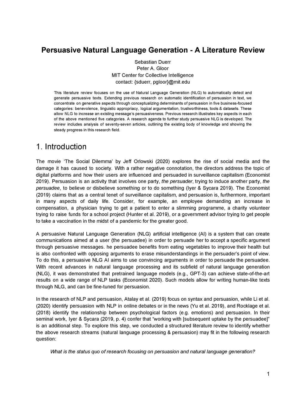 This literature review focuses on the use of Natural Language Generation (NLG) to automatically detect and generate persuasive texts. Extending previous research on automatic identification of persuasion in text, we concentrate on generative aspects through conceptualizing determinants of persuasion in five business-focused categories: benevolence, linguistic appropriacy, logical argumentation, trustworthiness, tools and datasets. These allow NLG to increase an existing message's persuasiveness. Previous research illustrates key aspects in each of the above mentioned five categories. A research agenda to further study persuasive NLG is developed. The review includes analysis of seventy-seven articles, outlining the existing body of knowledge and showing the steady progress in this research field.
