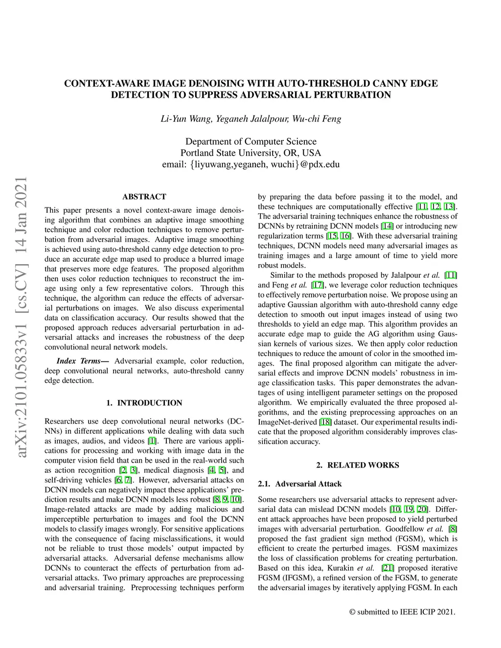This paper presents a novel context-aware image denoising algorithm that combines an adaptive image smoothing technique and color reduction techniques to remove perturbation from adversarial images. Adaptive image smoothing is achieved using auto-threshold canny edge detection to produce an accurate edge map used to produce a blurred image that preserves more edge features. The proposed algorithm then uses color reduction techniques to reconstruct the image using only a few representative colors. Through this technique, the algorithm can reduce the effects of adversarial perturbations on images. We also discuss experimental data on classification accuracy. Our results showed that the proposed approach reduces adversarial perturbation in adversarial attacks and increases the robustness of the deep convolutional neural network models.