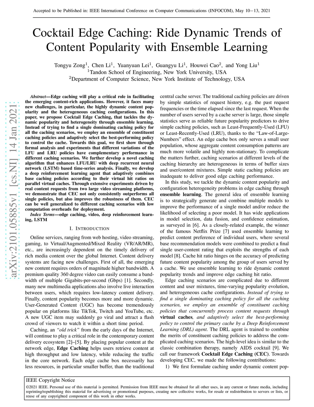 Edge caching will play a critical role in facilitating the emerging content-rich applications. However, it faces many new challenges, in particular, the highly dynamic content popularity and the heterogeneous caching configurations. In this paper, we propose Cocktail Edge Caching, that tackles the dynamic popularity and heterogeneity through ensemble learning. Instead of trying to find a single dominating caching policy for all the caching scenarios, we employ an ensemble of constituent caching policies and adaptively select the best-performing policy to control the cache. Towards this goal, we first show through formal analysis and experiments that different variations of the LFU and LRU policies have complementary performance in different caching scenarios. We further develop a novel caching algorithm that enhances LFU/LRU with deep recurrent neural network (LSTM) based time-series analysis. Finally, we develop a deep reinforcement learning agent that adaptively combines base caching policies according to their virtual hit ratios on parallel virtual caches. Through extensive experiments driven by real content requests from two large video streaming platforms, we demonstrate that CEC not only consistently outperforms all single policies, but also improves the robustness of them. CEC can be well generalized to different caching scenarios with low computation overheads for deployment.