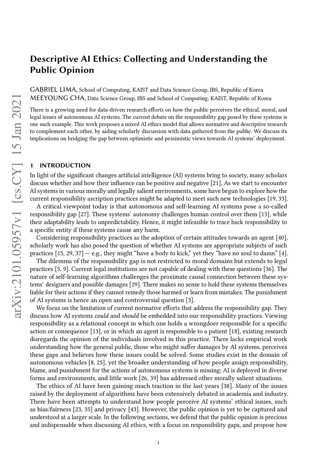 There is a growing need for data-driven research efforts on how the public perceives the ethical, moral, and legal issues of autonomous AI systems. The current debate on the responsibility gap posed by these systems is one such example. This work proposes a mixed AI ethics model that allows normative and descriptive research to complement each other, by aiding scholarly discussion with data gathered from the public. We discuss its implications on bridging the gap between optimistic and pessimistic views towards AI systems' deployment.