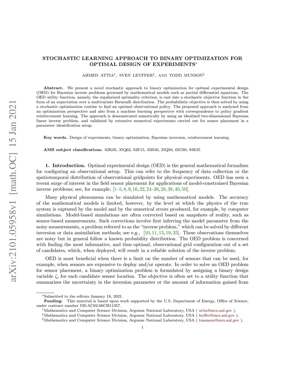 We present a novel stochastic approach to binary optimization for optimal experimental design (OED) for Bayesian inverse problems governed by mathematical models such as partial differential equations. The OED utility function, namely, the regularized optimality criterion, is cast into a stochastic objective function in the form of an expectation over a multivariate Bernoulli distribution. The probabilistic objective is then solved by using a stochastic optimization routine to find an optimal observational policy. The proposed approach is analyzed from an optimization perspective and also from a machine learning perspective with correspondence to policy gradient reinforcement learning. The approach is demonstrated numerically by using an idealized two-dimensional Bayesian linear inverse problem, and validated by extensive numerical experiments carried out for sensor placement in a parameter identification setup.