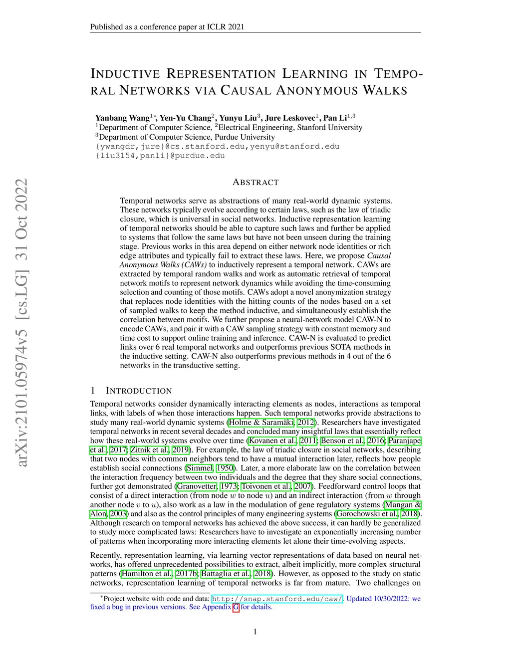 Temporal networks serve as abstractions of many real-world dynamic systems. These networks typically evolve according to certain laws, such as the law of triadic closure, which is universal in social networks. Inductive representation learning of temporal networks should be able to capture such laws and further be applied to systems that follow the same laws but have not been unseen during the training stage. Previous works in this area depend on either network node identities or rich edge attributes and typically fail to extract these laws. Here, we propose Causal Anonymous Walks (CAWs) to inductively represent a temporal network. CAWs are extracted by temporal random walks and work as automatic retrieval of temporal network motifs to represent network dynamics while avoiding the time-consuming selection and counting of those motifs. CAWs adopt a novel anonymization strategy that replaces node identities with the hitting counts of the nodes based on a set of sampled walks to keep the method inductive, and simultaneously establish the correlation between motifs. We further propose a neural-network model CAW-N to encode CAWs, and pair it with a CAW sampling strategy with constant memory and time cost to support online training and inference. CAW-N is evaluated to predict links over 6 real temporal networks and uniformly outperforms previous SOTA methods by averaged 10% AUC gain in the inductive setting. CAW-N also outperforms previous methods in 4 out of the 6 networks in the transductive setting.