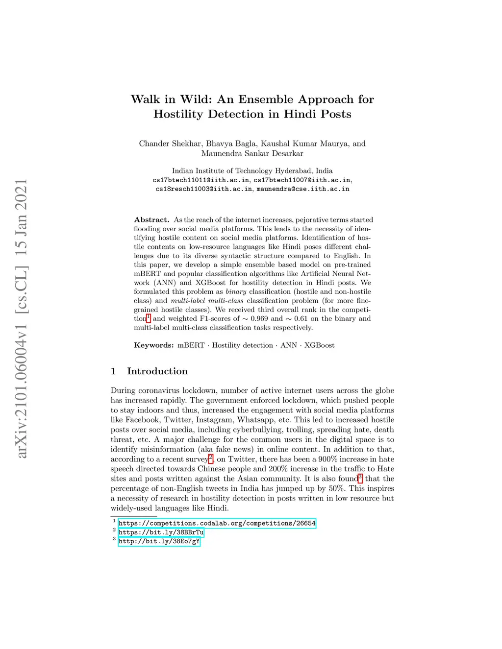 Walk in Wild: An Ensemble Approach for Hostility Detection in Hindi