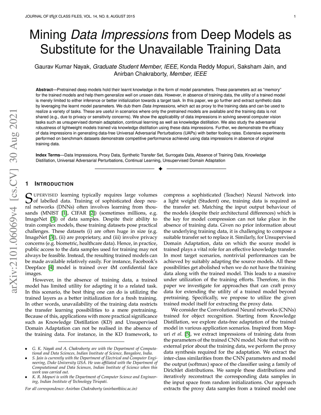 Pretrained deep models hold their learnt knowledge in the form of model parameters. These parameters act as "memory" for the trained models and help them generalize well on unseen data. However, in absence of training data, the utility of a trained model is merely limited to either inference or better initialization towards a target task. In this paper, we go further and extract synthetic data by leveraging the learnt model parameters. We dub them "Data Impressions", which act as proxy to the training data and can be used to realize a variety of tasks. These are useful in scenarios where only the pretrained models are available and the training data is not shared (e.g., due to privacy or sensitivity concerns). We show the applicability of data impressions in solving several computer vision tasks such as unsupervised domain adaptation, continual learning as well as knowledge distillation. We also study the adversarial robustness of lightweight models trained via knowledge distillation using these data impressions. Further, we demonstrate the efficacy of data impressions in generating data-free Universal Adversarial Perturbations (UAPs) with better fooling rates. Extensive experiments performed on benchmark datasets demonstrate competitive performance achieved using data impressions in absence of original training data.