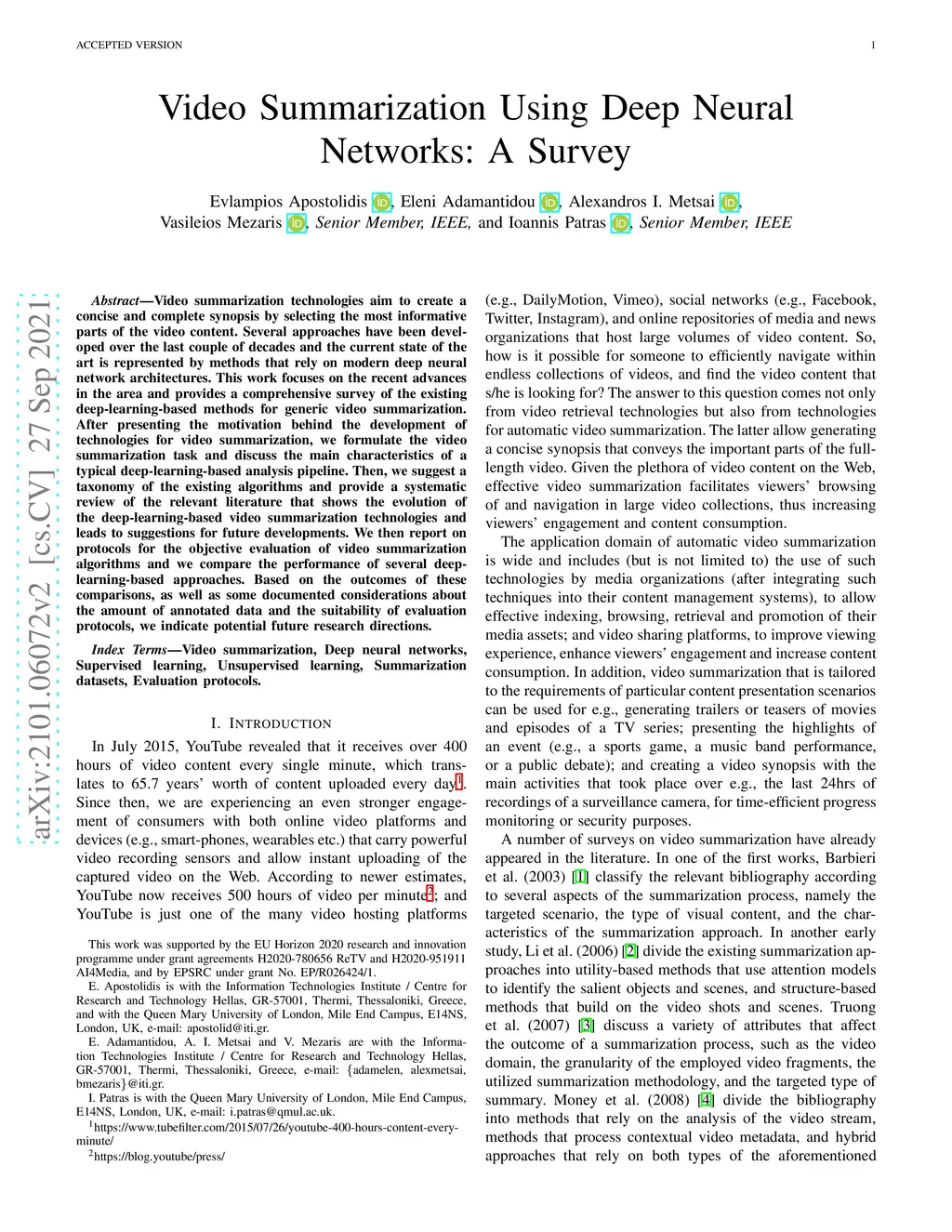Video summarization technologies aim to create a concise and complete synopsis by selecting the most informative parts of the video content. Several approaches have been developed over the last couple of decades and the current state of the art is represented by methods that rely on modern deep neural network architectures. This work focuses on the recent advances in the area and provides a comprehensive survey of the existing deep-learning-based methods for generic video summarization. After presenting the motivation behind the development of technologies for video summarization, we formulate the video summarization task and discuss the main characteristics of a typical deep-learning-based analysis pipeline. Then, we suggest a taxonomy of the existing algorithms and provide a systematic review of the relevant literature that shows the evolution of the deep-learning-based video summarization technologies and leads to suggestions for future developments. We then report on protocols for the objective evaluation of video summarization algorithms and we compare the performance of several deep-learning-based approaches. Based on the outcomes of these comparisons, as well as some documented considerations about the amount of annotated data and the suitability of evaluation protocols, we indicate potential future research directions.