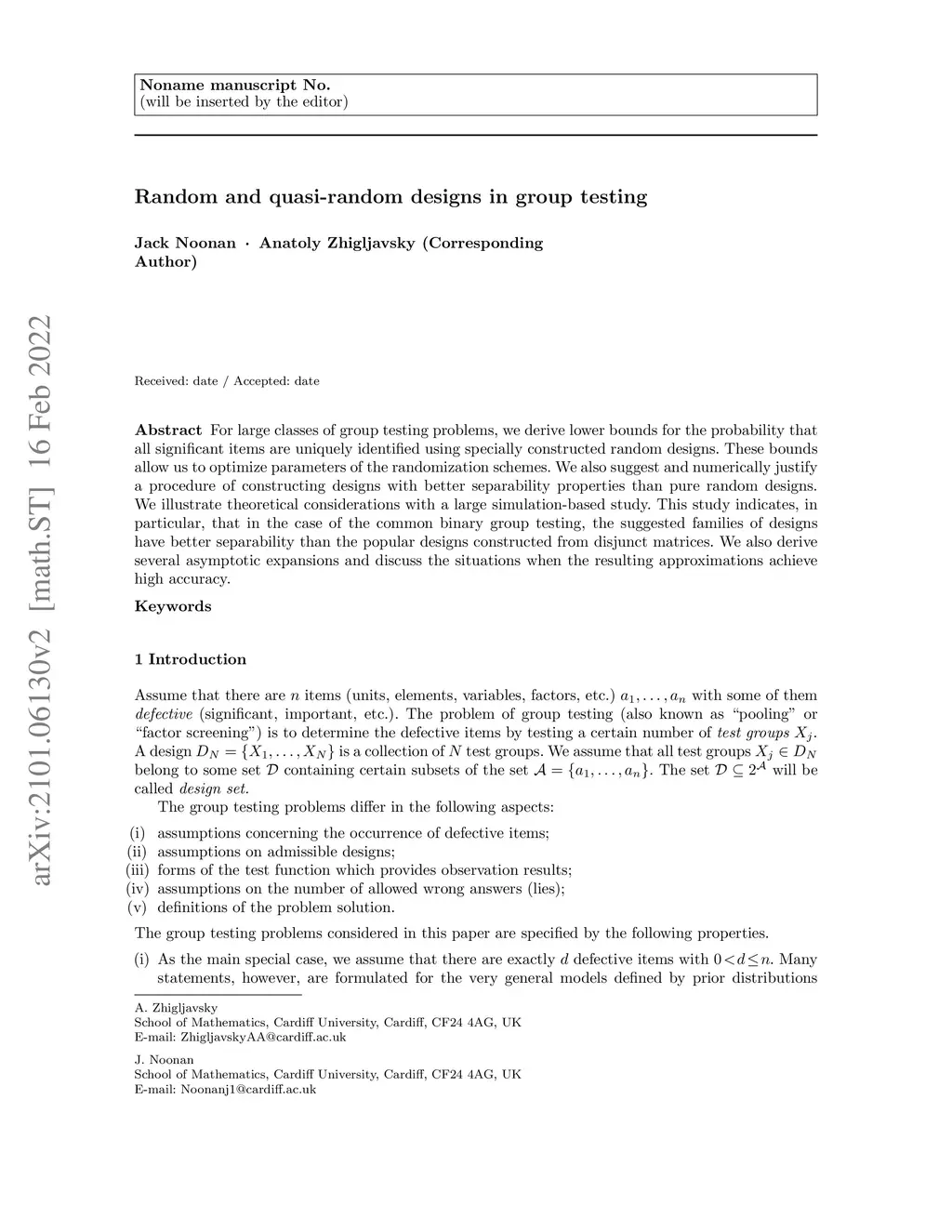For large classes of group testing problems, we derive lower bounds for the probability that all significant items are uniquely identified using specially constructed random designs. These bounds allow us to optimize parameters of the randomization schemes. We also suggest and numerically justify a procedure of constructing designs with better separability properties than pure random designs. We illustrate theoretical considerations with a large simulation-based study. This study indicates, in particular, that in the case of the common binary group testing, the suggested families of designs have better separability than the popular designs constructed from disjunct matrices. We also derive several asymptotic expansions and discuss the situations when the resulting approximations achieve high accuracy.
