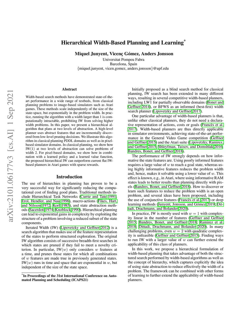 Width-based search methods have demonstrated state-of-the-art performance in a wide range of testbeds, from classical planning problems to image-based simulators such as Atari games. These methods scale independently of the size of the state-space, but exponentially in the problem width. In practice, running the algorithm with a width larger than 1 is computationally intractable, prohibiting IW from solving higher width problems. In this paper, we present a hierarchical algorithm that plans at two levels of abstraction. A high-level planner uses abstract features that are incrementally discovered from low-level pruning decisions. We illustrate this algorithm in classical planning PDDL domains as well as in pixel-based simulator domains. In classical planning, we show how IW(1) at two levels of abstraction can solve problems of width 2. For pixel-based domains, we show how in combination with a learned policy and a learned value function, the proposed hierarchical IW can outperform current flat IW-based planners in Atari games with sparse rewards.