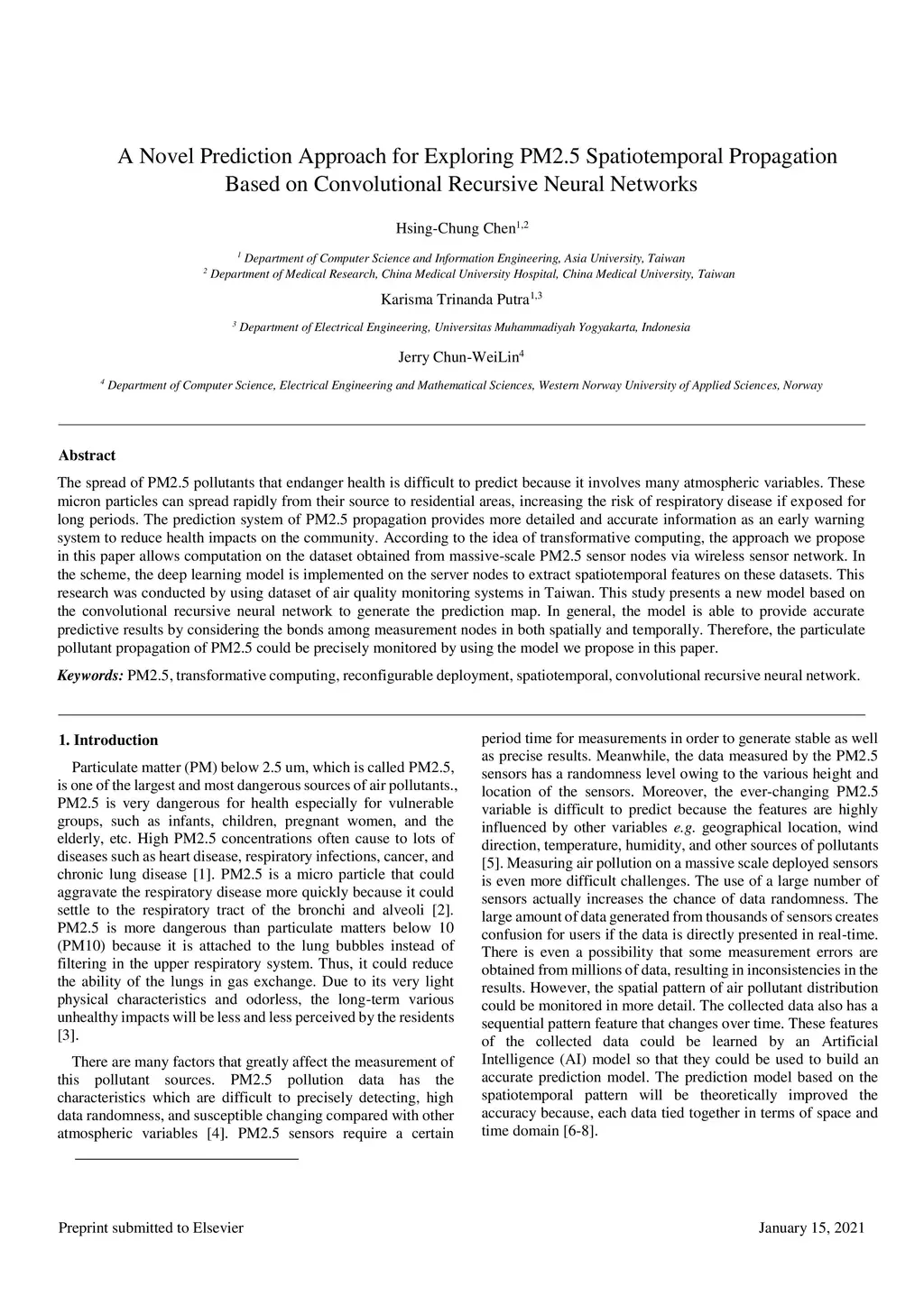 The spread of PM2.5 pollutants that endanger health is difficult to predict because it involves many atmospheric variables. These micron particles can spread rapidly from their source to residential areas, increasing the risk of respiratory disease if exposed for long periods. The prediction system of PM2.5 propagation provides more detailed and accurate information as an early warning system to reduce health impacts on the community. According to the idea of transformative computing, the approach we propose in this paper allows computation on the dataset obtained from massive-scale PM2.5 sensor nodes via wireless sensor network. In the scheme, the deep learning model is implemented on the server nodes to extract spatiotemporal features on these datasets. This research was conducted by using dataset of air quality monitoring systems in Taiwan. This study presents a new model based on the convolutional recursive neural network to generate the prediction map. In general, the model is able to provide accurate predictive results by considering the bonds among measurement nodes in both spatially and temporally. Therefore, the particulate pollutant propagation of PM2.5 could be precisely monitored by using the model we propose in this paper.