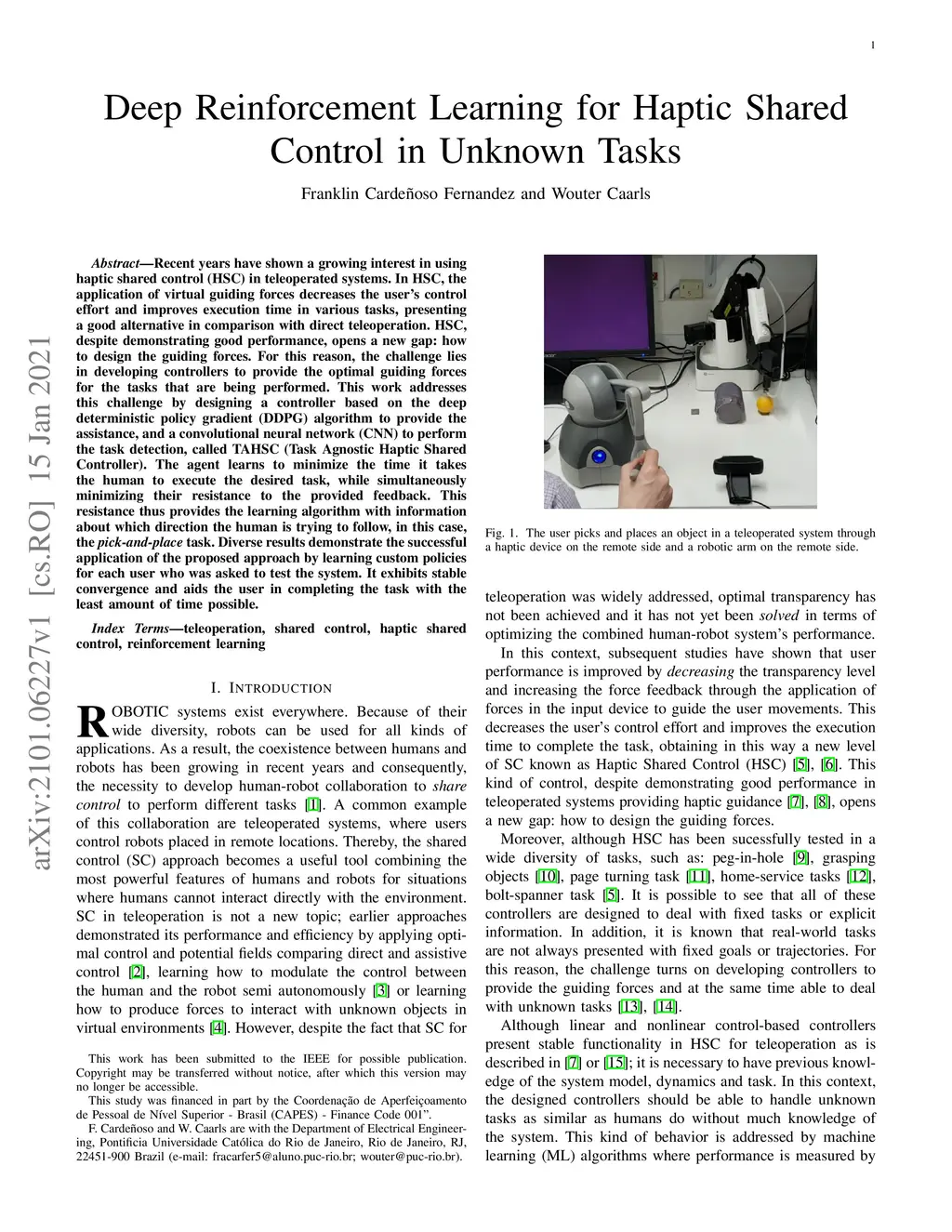 Recent years have shown a growing interest in using haptic shared control (HSC) in teleoperated systems. In HSC, the application of virtual guiding forces decreases the user's control effort and improves execution time in various tasks, presenting a good alternative in comparison with direct teleoperation. HSC, despite demonstrating good performance, opens a new gap: how to design the guiding forces. For this reason, the challenge lies in developing controllers to provide the optimal guiding forces for the tasks that are being performed. This work addresses this challenge by designing a controller based on the deep deterministic policy gradient (DDPG) algorithm to provide the assistance, and a convolutional neural network (CNN) to perform the task detection, called TAHSC (Task Agnostic Haptic Shared Controller). The agent learns to minimize the time it takes the human to execute the desired task, while simultaneously minimizing their resistance to the provided feedback. This resistance thus provides the learning algorithm with information about which direction the human is trying to follow, in this case, the pick-and-place task. Diverse results demonstrate the successful application of the proposed approach by learning custom policies for each user who was asked to test the system. It exhibits stable convergence and aids the user in completing the task with the least amount of time possible.