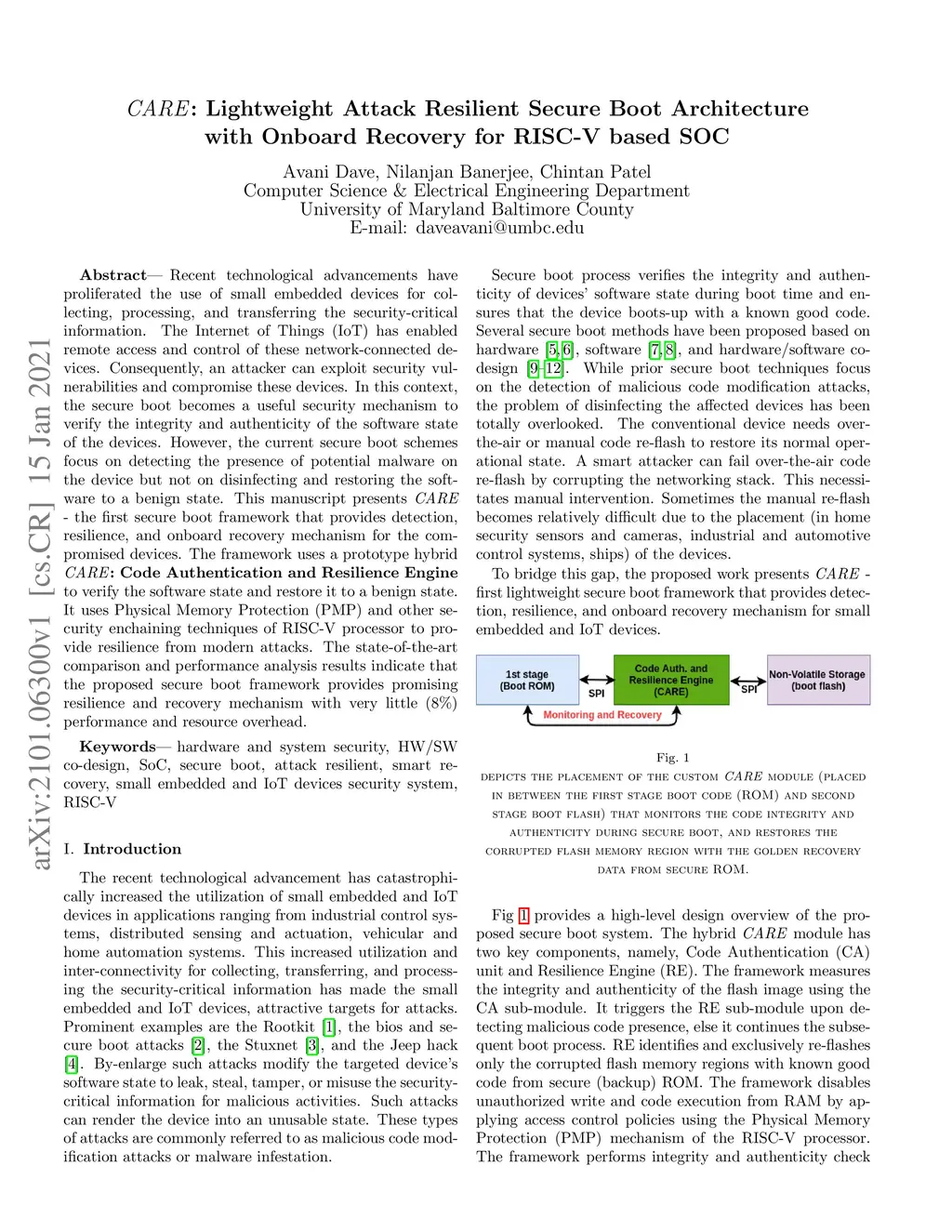 Recent technological advancements have proliferated the use of small embedded devices for collecting, processing, and transferring the security-critical information. The Internet of Things (IoT) has enabled remote access and control of these network-connected devices. Consequently, an attacker can exploit security vulnerabilities and compromise these devices. In this context, the secure boot becomes a useful security mechanism to verify the integrity and authenticity of the software state of the devices. However, the current secure boot schemes focus on detecting the presence of potential malware on the device but not on disinfecting and restoring the soft-ware to a benign state. This manuscript presents CARE- the first secure boot framework that provides detection, resilience, and onboard recovery mechanism for the com-promised devices. The framework uses a prototype hybrid CARE: Code Authentication and Resilience Engine to verify the software state and restore it to a benign state. It uses Physical Memory Protection (PMP) and other security enchaining techniques of RISC-V processor to pro-vide resilience from modern attacks. The state-of-the-art comparison and performance analysis results indicate that the proposed secure boot framework provides a promising resilience and recovery mechanism with very little 8 % performance and resource overhead