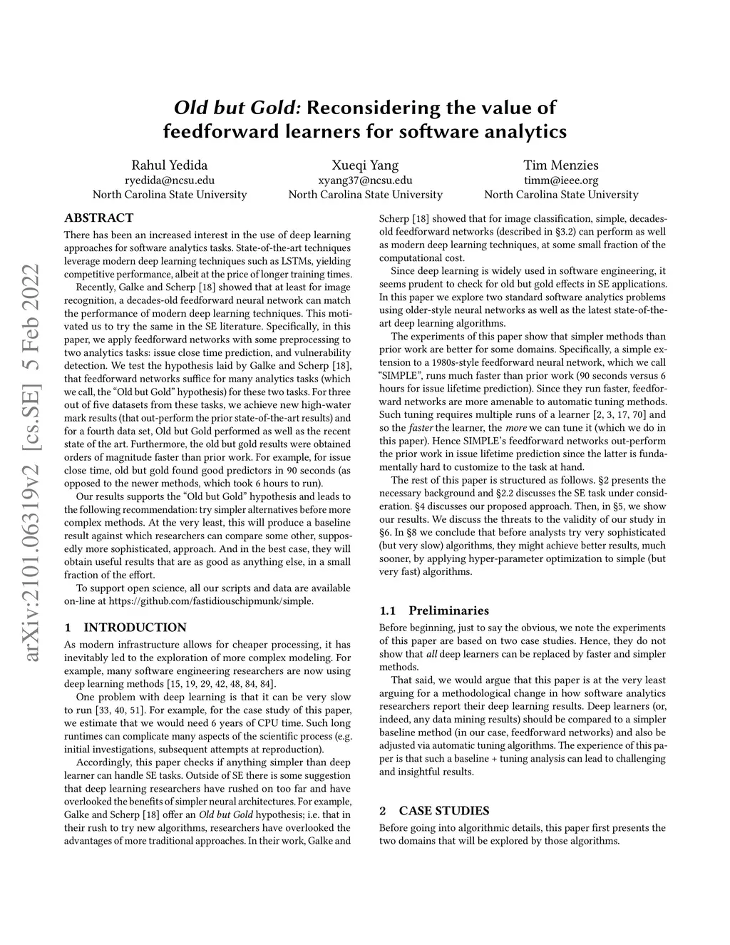There has been an increased interest in the use of deep learning approaches for software analytics tasks. State-of-the-art techniques leverage modern deep learning techniques such as LSTMs, yielding competitive performance, albeit at the price of longer training times. Recently, Galke and Scherp [18] showed that at least for image recognition, a decades-old feedforward neural network can match the performance of modern deep learning techniques. This motivated us to try the same in the SE literature. Specifically, in this paper, we apply feedforward networks with some preprocessing to two analytics tasks: issue close time prediction, and vulnerability detection. We test the hypothesis laid by Galke and Scherp [18], that feedforward networks suffice for many analytics tasks (which we call, the "Old but Gold" hypothesis) for these two tasks. For three out of five datasets from these tasks, we achieve new high-water mark results (that out-perform the prior state-of-the-art results) and for a fourth data set, Old but Gold performed as well as the recent state of the art. Furthermore, the old but gold results were obtained orders of magnitude faster than prior work. For example, for issue close time, old but gold found good predictors in 90 seconds (as opposed to the newer methods, which took 6 hours to run). Our results supports the "Old but Gold" hypothesis and leads to the following recommendation: try simpler alternatives before more complex methods. At the very least, this will produce a baseline result against which researchers can compare some other, supposedly more sophisticated, approach. And in the best case, they will obtain useful results that are as good as anything else, in a small fraction of the effort. To support open science, all our scripts and data are available on-line at https://github.com/fastidiouschipmunk/simple.