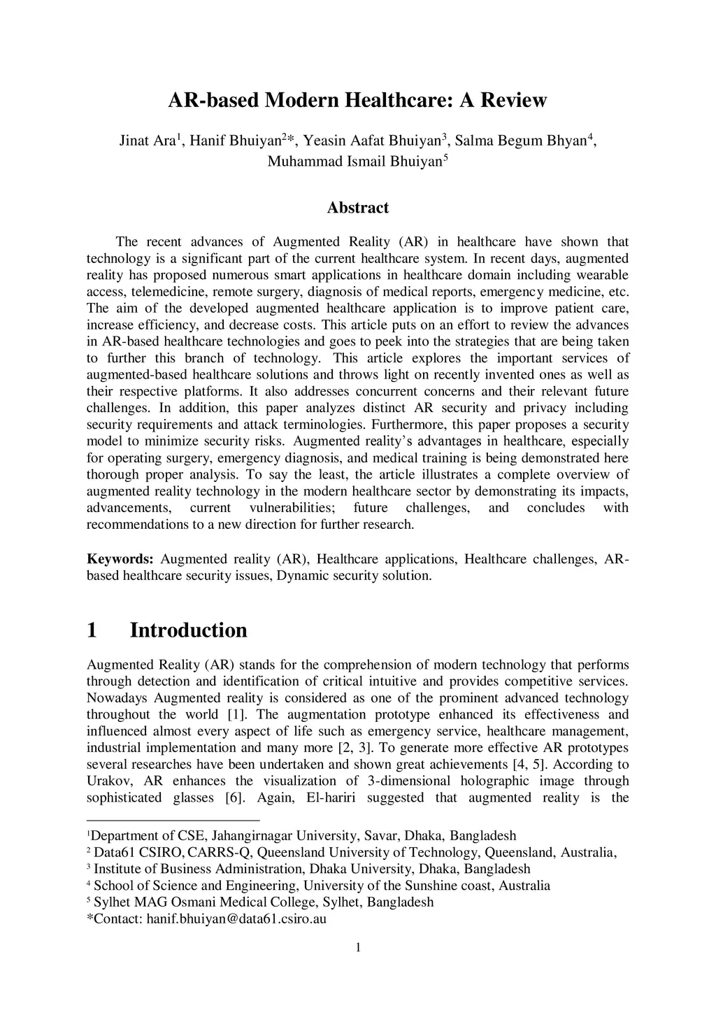 The recent advances of Augmented Reality (AR) in healthcare have shown that technology is a significant part of the current healthcare system. In recent days, augmented reality has proposed numerous smart applications in healthcare domain including wearable access, telemedicine, remote surgery, diagnosis of medical reports, emergency medicine, etc. The aim of the developed augmented healthcare application is to improve patient care, increase efficiency, and decrease costs. This article puts on an effort to review the advances in AR-based healthcare technologies and goes to peek into the strategies that are being taken to further this branch of technology. This article explores the important services of augmented-based healthcare solutions and throws light on recently invented ones as well as their respective platforms. It also addresses concurrent concerns and their relevant future challenges. In addition, this paper analyzes distinct AR security and privacy including security requirements and attack terminologies. Furthermore, this paper proposes a security model to minimize security risks. Augmented reality advantages in healthcare, especially for operating surgery, emergency diagnosis, and medical training is being demonstrated here thorough proper analysis. To say the least, the article illustrates a complete overview of augmented reality technology in the modern healthcare sector by demonstrating its impacts, advancements, current vulnerabilities; future challenges, and concludes with recommendations to a new direction for further research.