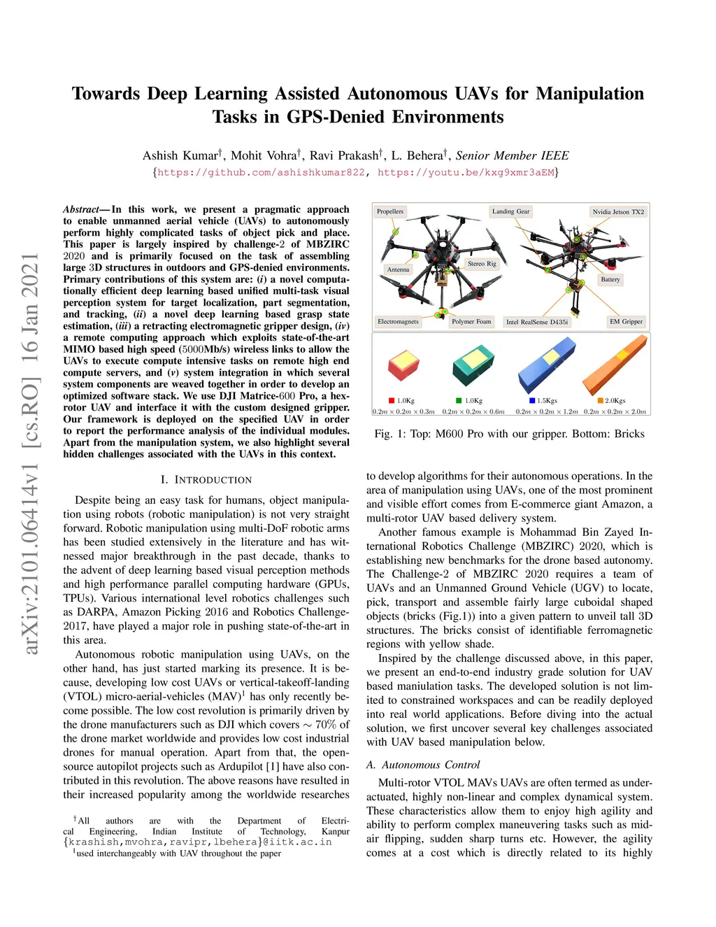 In this work, we present a pragmatic approach to enable unmanned aerial vehicle (UAVs) to autonomously perform highly complicated tasks of object pick and place. This paper is largely inspired by challenge-2 of MBZIRC 2020 and is primarily focused on the task of assembling large 3D structures in outdoors and GPS-denied environments. Primary contributions of this system are: (i) a novel computationally efficient deep learning based unified multi-task visual perception system for target localization, part segmentation, and tracking, (ii) a novel deep learning based grasp state estimation, (iii) a retracting electromagnetic gripper design, (iv) a remote computing approach which exploits state-of-the-art MIMO based high speed (5000Mb/s) wireless links to allow the UAVs to execute compute intensive tasks on remote high end compute servers, and (v) system integration in which several system components are weaved together in order to develop an optimized software stack. We use DJI Matrice-600 Pro, a hex-rotor UAV and interface it with the custom designed gripper. Our framework is deployed on the specified UAV in order to report the performance analysis of the individual modules. Apart from the manipulation system, we also highlight several hidden challenges associated with the UAVs in this context.