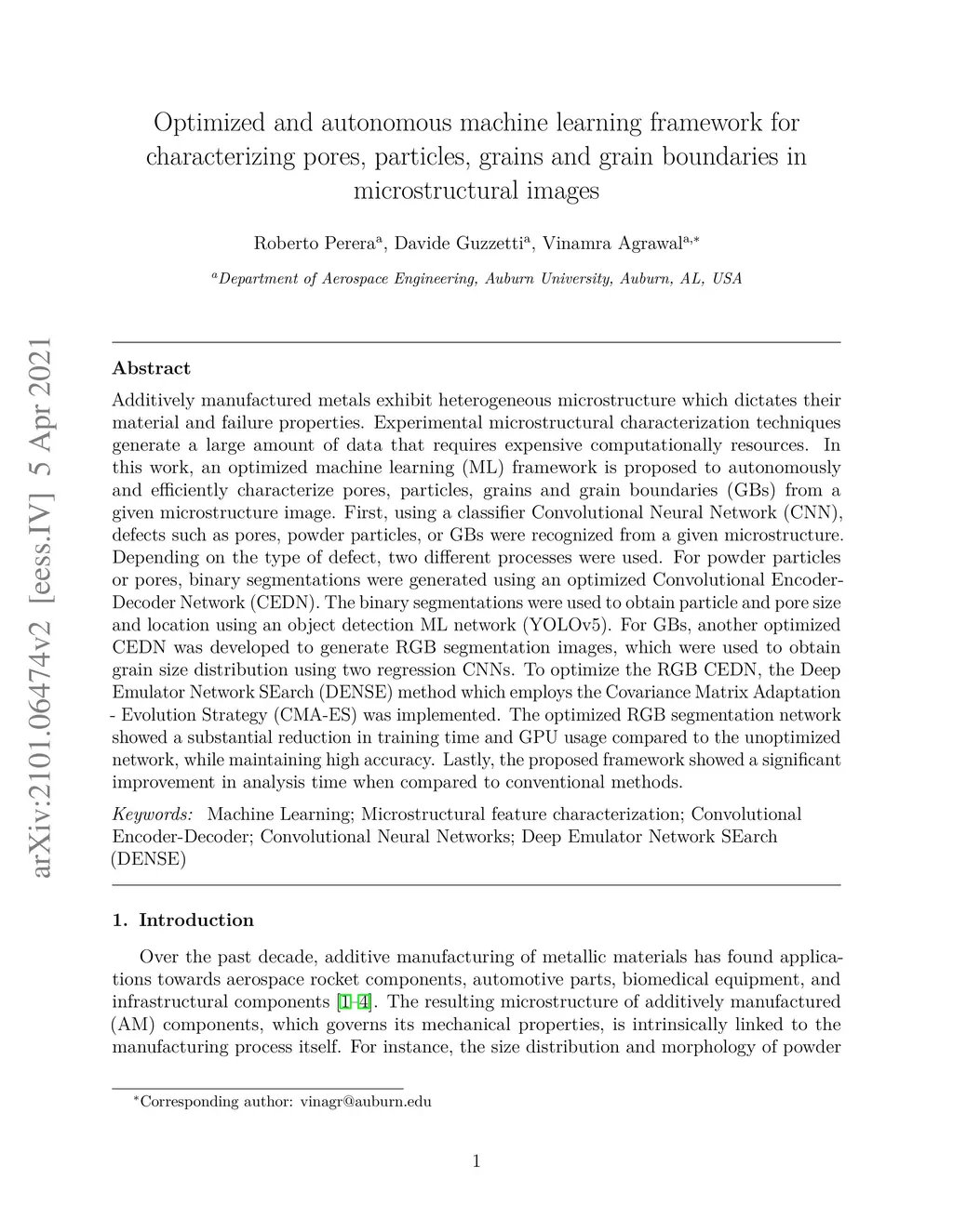 Additively manufactured metals exhibit heterogeneous microstructure which dictates their material and failure properties. Experimental microstructural characterization techniques generate a large amount of data that requires expensive computationally resources. In this work, an optimized machine learning (ML) framework is proposed to autonomously and efficiently characterize pores, particles, grains and grain boundaries (GBs) from a given microstructure image. First, using a classifier Convolutional Neural Network (CNN), defects such as pores, powder particles, or GBs were recognized from a given microstructure. Depending on the type of defect, two different processes were used. For powder particles or pores, binary segmentations were generated using an optimized Convolutional Encoder-Decoder Network (CEDN). The binary segmentations were used to used obtain particle and pore size and bounding boxes using an object detection ML network (YOLOv5). For GBs, another optimized CEDN was developed to generate RGB segmentation images, which were used to obtain grain size distribution using two regression CNNS. To optimize the RGB CEDN, the Deep Emulator Network SEarch (DENSE) method which employs the Covariance Matrix Adaptation - Evolution Strategy (CMA-ES) was implemented. The optimized RGB segmentation network showed a substantial reduction in training time and GPU usage compared to the unoptimized network, while maintaining high accuracy. Lastly, the proposed framework showed a significant improvement in analysis time when compared to conventional methods.