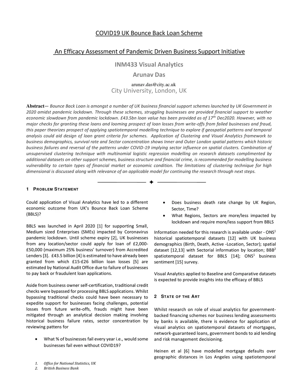 Bounce Back Loan is amongst a number of UK business financial support schemes launched by UK Government in 2020 amidst pandemic lockdown. Through these schemes, struggling businesses are provided financial support to weather economic slowdown from pandemic lockdown. {\pounds}43.5bn loan value has been provided as of 17th Dec2020. However, with no major checks for granting these loans and looming prospect of loan losses from write-offs from failed businesses and fraud, this paper theorizes prospect of applying spatiotemporal modelling technique to explore if geospatial patterns and temporal analysis could aid design of loan grant criteria for schemes. Application of Clustering and Visual Analytics framework to business demographics, survival rate and Sector concentration shows Inner and Outer London spatial patterns which historic business failures and reversal of the patterns under COVID-19 implying sector influence on spatial clusters. Combination of unsupervised clustering technique with multinomial logistic regression modelling on research datasets complimented by additional datasets on other support schemes, business structure and financial crime, is recommended for modelling business vulnerability to certain types of financial market or economic condition. The limitations of clustering technique for high dimensional is discussed along with relevance of an applicable model for continuing the research through next steps.
