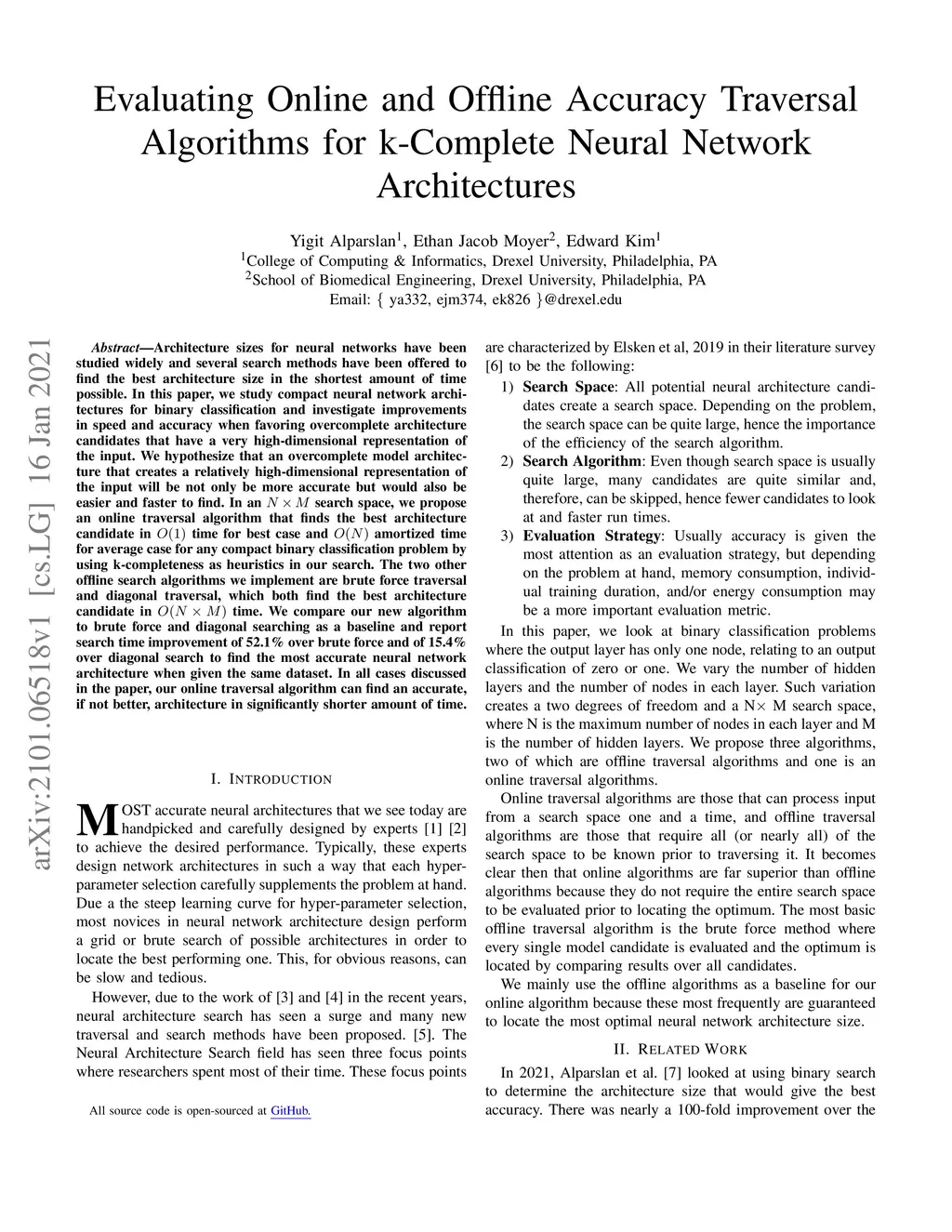 Architecture sizes for neural networks have been studied widely and several search methods have been offered to find the best architecture size in the shortest amount of time possible. In this paper, we study compact neural network architectures for binary classification and investigate improvements in speed and accuracy when favoring overcomplete architecture candidates that have a very high-dimensional representation of the input. We hypothesize that an overcomplete model architecture that creates a relatively high-dimensional representation of the input will be not only be more accurate but would also be easier and faster to find. In an NxM search space, we propose an online traversal algorithm that finds the best architecture candidate in O(1) time for best case and O(N) amortized time for average case for any compact binary classification problem by using k-completeness as heuristics in our search. The two other offline search algorithms we implement are brute force traversal and diagonal traversal, which both find the best architecture candidate in O(NxM) time. We compare our new algorithm to brute force and diagonal searching as a baseline and report search time improvement of 52.1% over brute force and of 15.4% over diagonal search to find the most accurate neural network architecture when given the same dataset. In all cases discussed in the paper, our online traversal algorithm can find an accurate, if not better, architecture in significantly shorter amount of time.