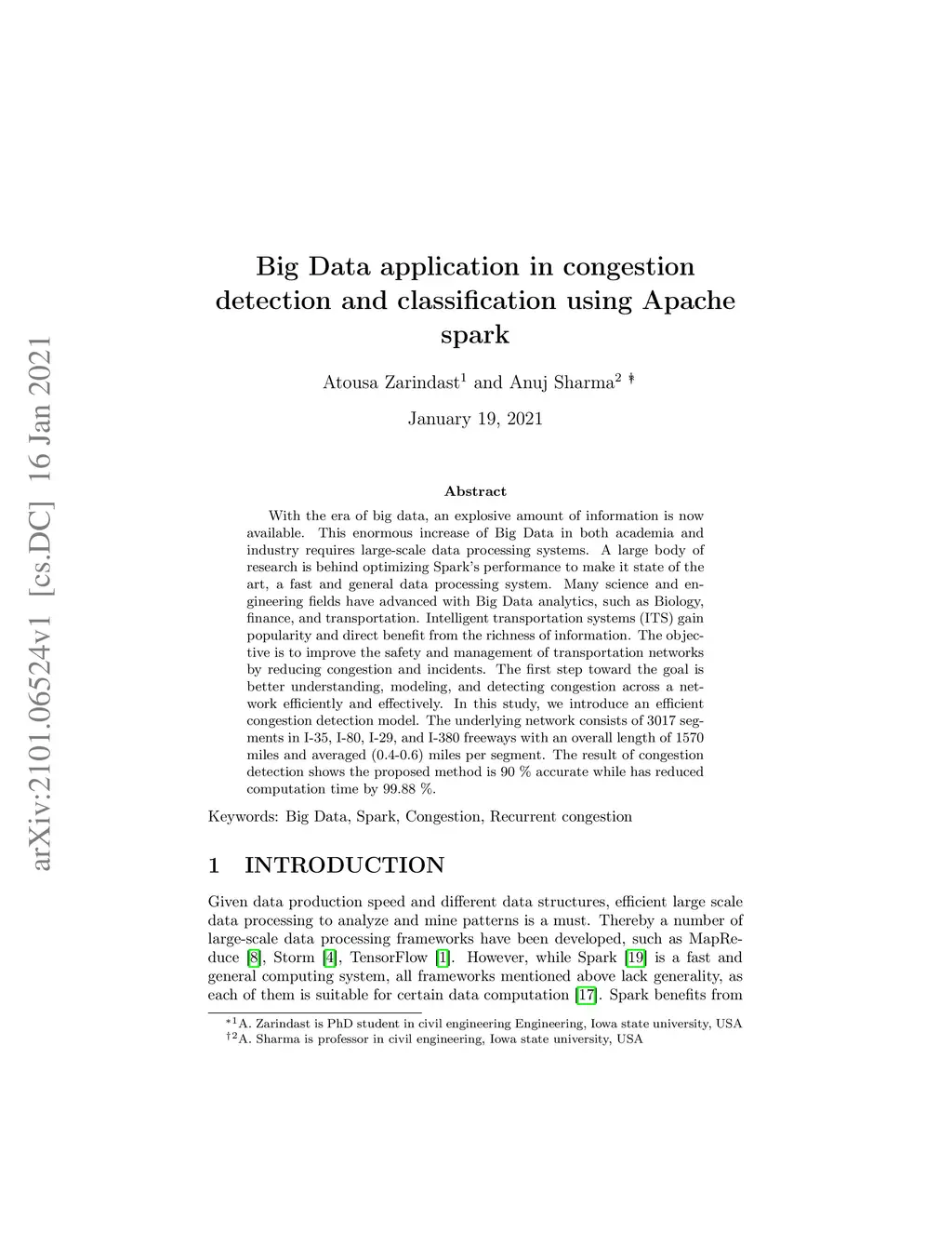With the era of big data, an explosive amount of information is now available. This enormous increase of Big Data in both academia and industry requires large-scale data processing systems. A large body of research is behind optimizing Spark's performance to make it state of the art, a fast and general data processing system. Many science and engineering fields have advanced with Big Data analytics, such as Biology, finance, and transportation. Intelligent transportation systems (ITS) gain popularity and direct benefit from the richness of information. The objective is to improve the safety and management of transportation networks by reducing congestion and incidents. The first step toward the goal is better understanding, modeling, and detecting congestion across a network efficiently and effectively. In this study, we introduce an efficient congestion detection model. The underlying network consists of 3017 segments in I-35, I-80, I-29, and I-380 freeways with an overall length of 1570 miles and averaged (0.4-0.6) miles per segment. The result of congestion detection shows the proposed method is 90% accurate while has reduced computation time by 99.88%.