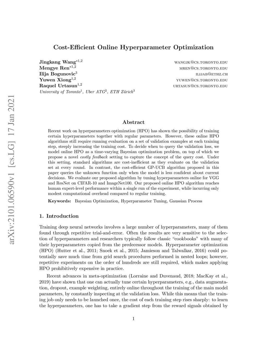 Recent work on hyperparameters optimization (HPO) has shown the possibility of training certain hyperparameters together with regular parameters. However, these online HPO algorithms still require running evaluation on a set of validation examples at each training step, steeply increasing the training cost. To decide when to query the validation loss, we model online HPO as a time-varying Bayesian optimization problem, on top of which we propose a novel \textit{costly feedback} setting to capture the concept of the query cost. Under this setting, standard algorithms are cost-inefficient as they evaluate on the validation set at every round. In contrast, the cost-efficient GP-UCB algorithm proposed in this paper queries the unknown function only when the model is less confident about current decisions. We evaluate our proposed algorithm by tuning hyperparameters online for VGG and ResNet on CIFAR-10 and ImageNet100. Our proposed online HPO algorithm reaches human expert-level performance within a single run of the experiment, while incurring only modest computational overhead compared to regular training.