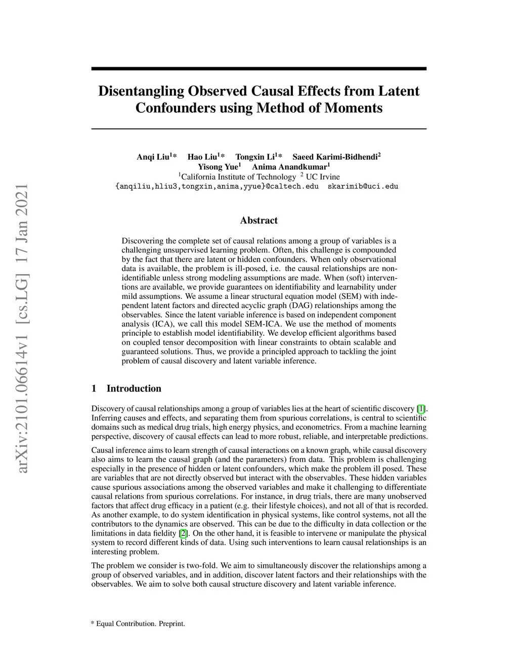 Discovering the complete set of causal relations among a group of variables is a challenging unsupervised learning problem. Often, this challenge is compounded by the fact that there are latent or hidden confounders. When only observational data is available, the problem is ill-posed, i.e. the causal relationships are non-identifiable unless strong modeling assumptions are made. When interventions are available, we provide guarantees on identifiability and learnability under mild assumptions. We assume a linear structural equation model (SEM) with independent latent factors and directed acyclic graph (DAG) relationships among the observables. Since the latent variable inference is based on independent component analysis (ICA), we call this model SEM-ICA. We use the method of moments principle to establish model identifiability. We develop efficient algorithms based on coupled tensor decomposition with linear constraints to obtain scalable and guaranteed solutions. Thus, we provide a principled approach to tackling the joint problem of causal discovery and latent variable inference.