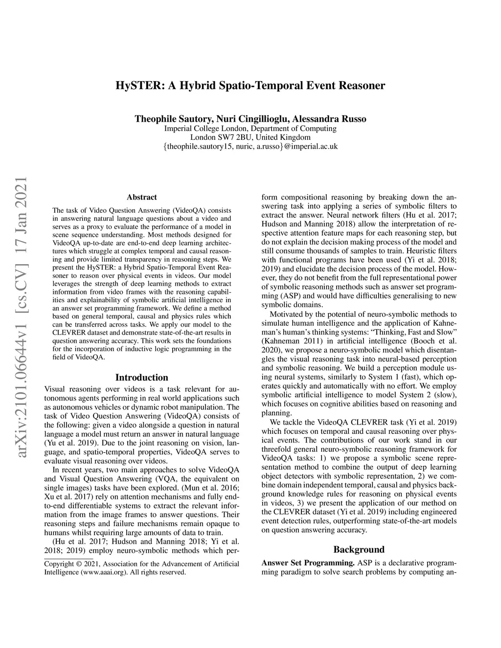 The task of Video Question Answering (VideoQA) consists in answering natural language questions about a video and serves as a proxy to evaluate the performance of a model in scene sequence understanding. Most methods designed for VideoQA up-to-date are end-to-end deep learning architectures which struggle at complex temporal and causal reasoning and provide limited transparency in reasoning steps. We present the HySTER: a Hybrid Spatio-Temporal Event Reasoner to reason over physical events in videos. Our model leverages the strength of deep learning methods to extract information from video frames with the reasoning capabilities and explainability of symbolic artificial intelligence in an answer set programming framework. We define a method based on general temporal, causal and physics rules which can be transferred across tasks. We apply our model to the CLEVRER dataset and demonstrate state-of-the-art results in question answering accuracy. This work sets the foundations for the incorporation of inductive logic programming in the field of VideoQA.