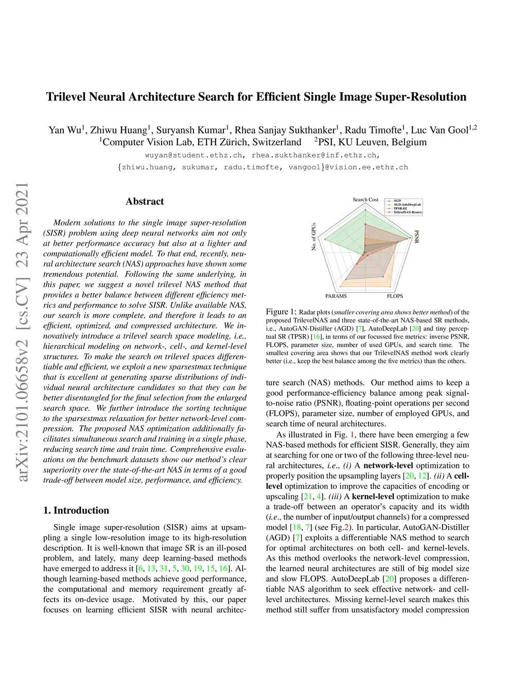 Modern solutions to the single image super-resolution (SISR) problem using deep neural networks aim not only at better performance accuracy but also at a lighter and computationally efficient model. To that end, recently, neural architecture search (NAS) approaches have shown some tremendous potential. Following the same underlying, in this paper, we suggest a novel trilevel NAS method that provides a better balance between different efficiency metrics and performance to solve SISR. Unlike available NAS, our search is more complete, and therefore it leads to an efficient, optimized, and compressed architecture. We innovatively introduce a trilevel search space modeling, i.e., hierarchical modeling on network-, cell-, and kernel-level structures. To make the search on trilevel spaces differentiable and efficient, we exploit a new sparsestmax technique that is excellent at generating sparse distributions of individual neural architecture candidates so that they can be better disentangled for the final selection from the enlarged search space. We further introduce the sorting technique to the sparsestmax relaxation for better network-level compression. The proposed NAS optimization additionally facilitates simultaneous search and training in a single phase, reducing search time and train time. Comprehensive evaluations on the benchmark datasets show our method's clear superiority over the state-of-the-art NAS in terms of a good trade-off between model size, performance, and efficiency.
