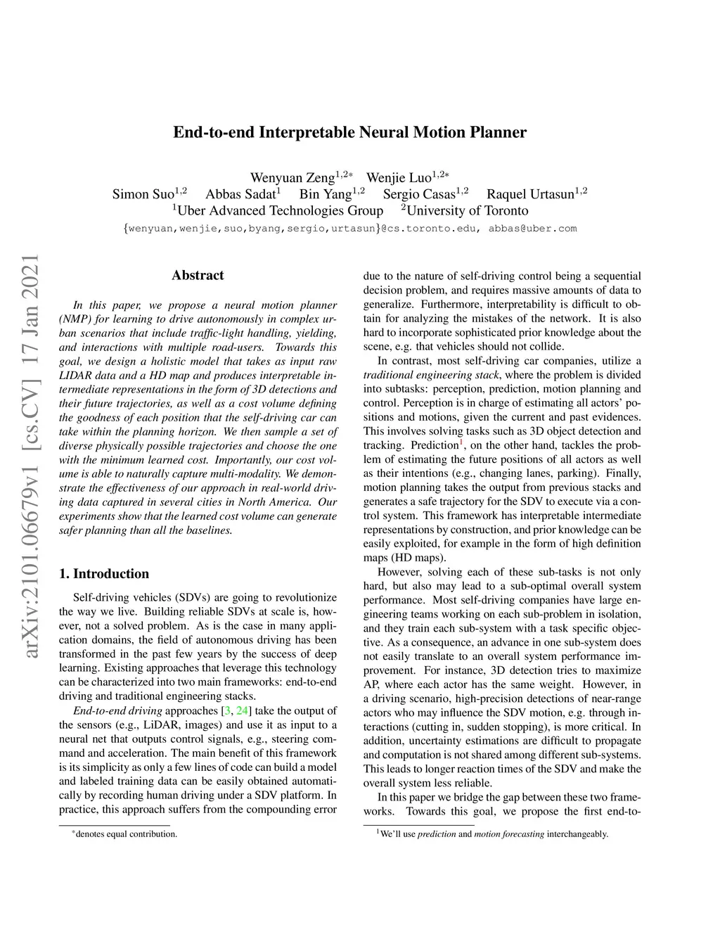 In this paper, we propose a neural motion planner (NMP) for learning to drive autonomously in complex urban scenarios that include traffic-light handling, yielding, and interactions with multiple road-users. Towards this goal, we design a holistic model that takes as input raw LIDAR data and a HD map and produces interpretable intermediate representations in the form of 3D detections and their future trajectories, as well as a cost volume defining the goodness of each position that the self-driving car can take within the planning horizon. We then sample a set of diverse physically possible trajectories and choose the one with the minimum learned cost. Importantly, our cost volume is able to naturally capture multi-modality. We demonstrate the effectiveness of our approach in real-world driving data captured in several cities in North America. Our experiments show that the learned cost volume can generate safer planning than all the baselines.