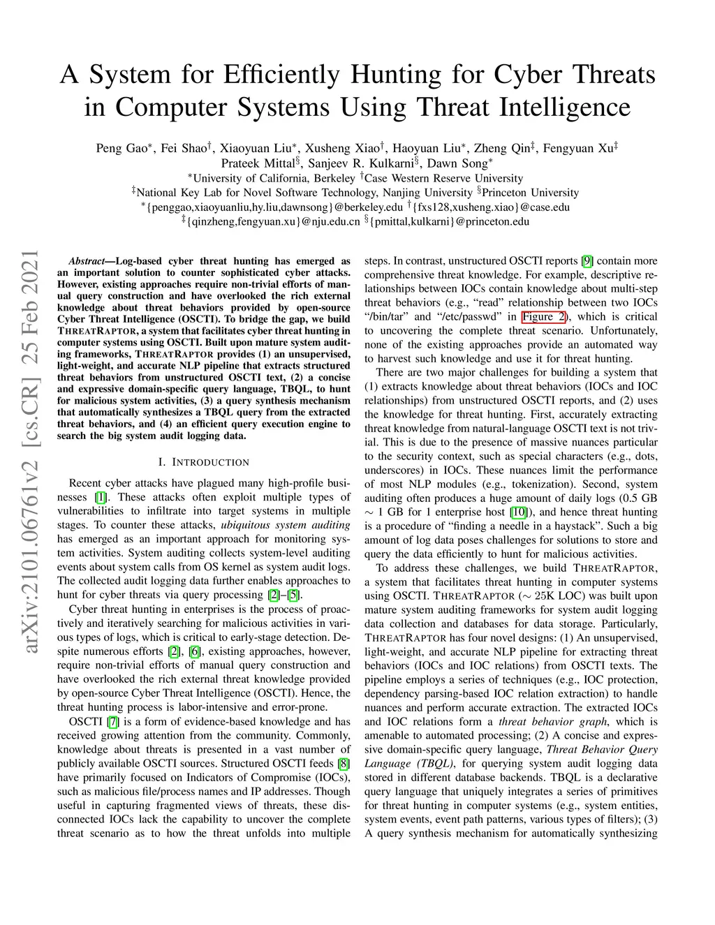 A System for Efficiently Hunting for Cyber Threats in Computer Systems