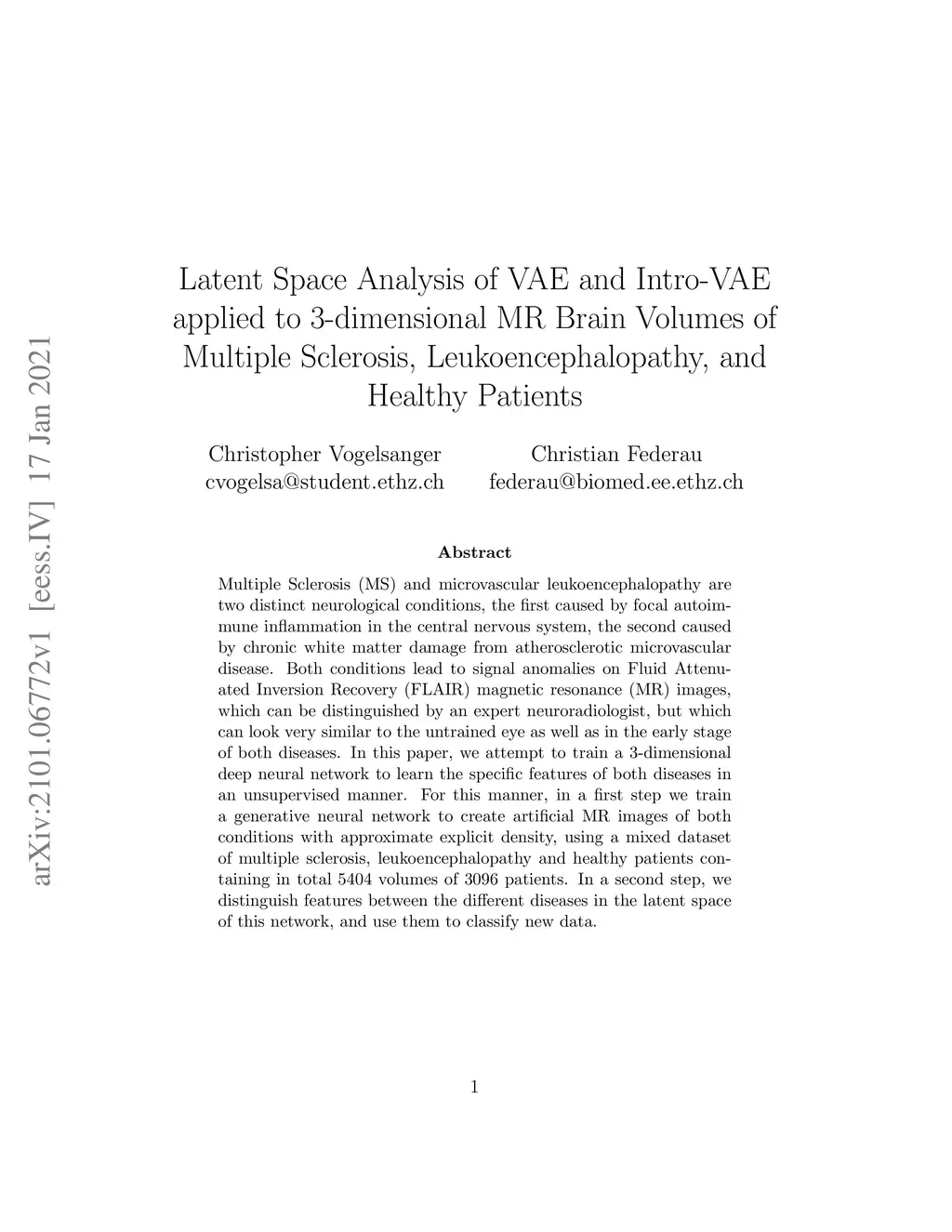 Multiple Sclerosis (MS) and microvascular leukoencephalopathy are two distinct neurological conditions, the first caused by focal autoimmune inflammation in the central nervous system, the second caused by chronic white matter damage from atherosclerotic microvascular disease. Both conditions lead to signal anomalies on Fluid Attenuated Inversion Recovery (FLAIR) magnetic resonance (MR) images, which can be distinguished by an expert neuroradiologist, but which can look very similar to the untrained eye as well as in the early stage of both diseases. In this paper, we attempt to train a 3-dimensional deep neural network to learn the specific features of both diseases in an unsupervised manner. For this manner, in a first step we train a generative neural network to create artificial MR images of both conditions with approximate explicit density, using a mixed dataset of multiple sclerosis, leukoencephalopathy and healthy patients containing in total 5404 volumes of 3096 patients. In a second step, we distinguish features between the different diseases in the latent space of this network, and use them to classify new data.