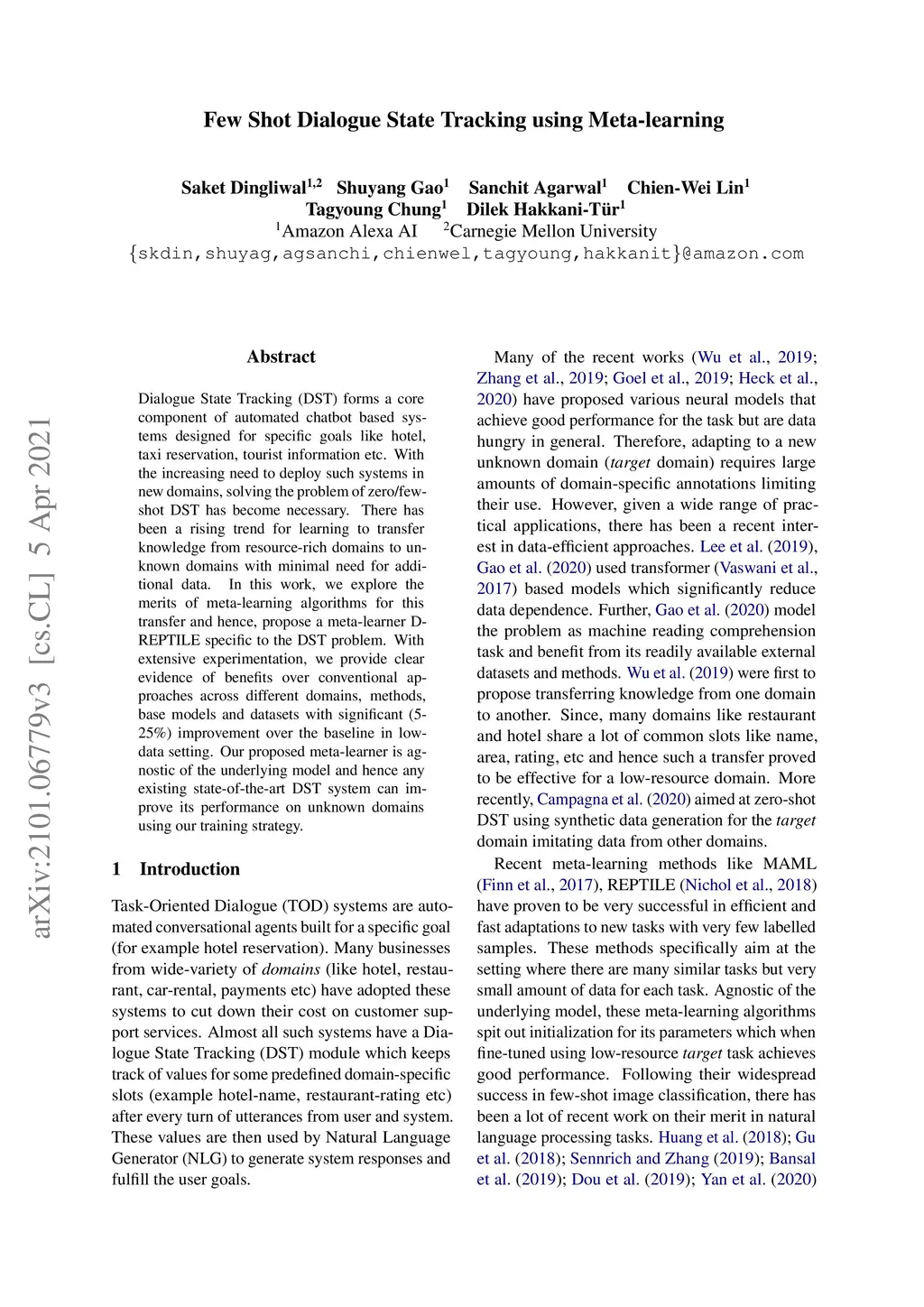 Few Shot Dialogue State Tracking using Meta-learning
