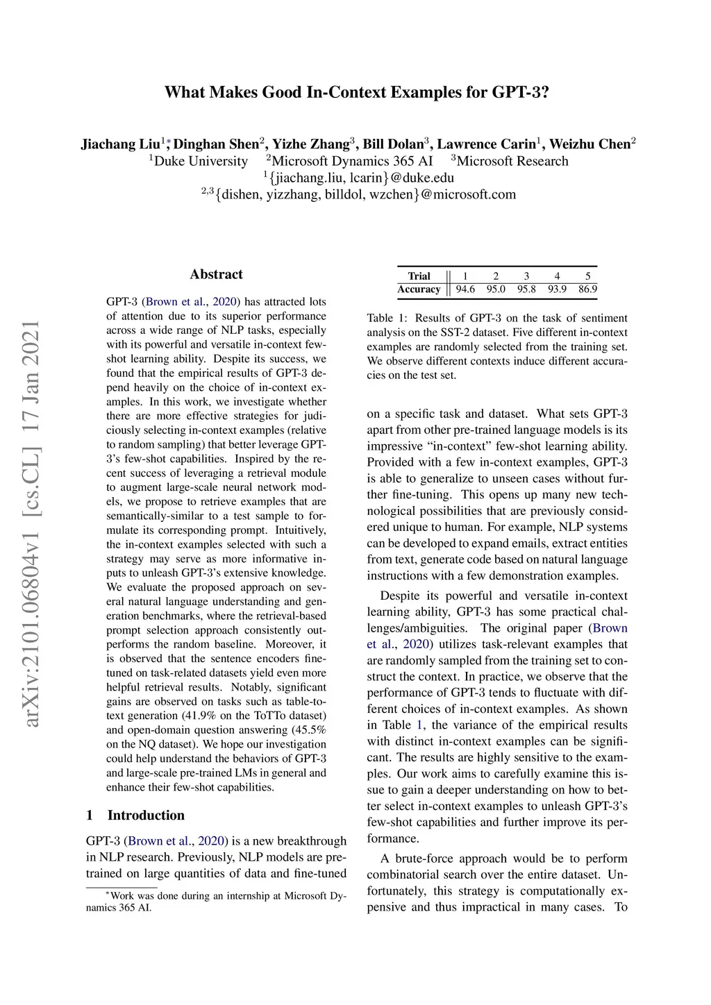 GPT- has attracted lots of attention due to its superior performance across a wide range of NLP tasks, especially with its powerful and versatile in-context few-shot learning ability. Despite its success, we found that the empirical results of GPT- depend heavily on the choice of in-context examples. In this work, we investigate whether there are more effective strategies for judiciously selecting in-context examples (relative to random sampling) that better leverage GPT-'s few-shot capabilities. Inspired by the recent success of leveraging a retrieval module to augment large-scale neural network models, we propose to retrieve examples that are semantically-similar to a test sample to formulate its corresponding prompt. Intuitively, the in-context examples selected with such a strategy may serve as more informative inputs to unleash GPT-'s extensive knowledge. We evaluate the proposed approach on several natural language understanding and generation benchmarks, where the retrieval-based prompt selection approach consistently outperforms the random baseline. Moreover, it is observed that the sentence encoders fine-tuned on task-related datasets yield even more helpful retrieval results. Notably, significant gains are observed on tasks such as table-to-text generation (41.9% on the ToTTo dataset) and open-domain question answering (45.5% on the NQ dataset). We hope our investigation could help understand the behaviors of GPT- and large-scale pre-trained LMs in general and enhance their few-shot capabilities.