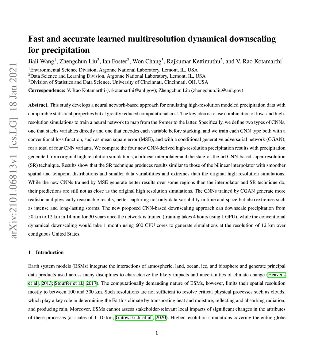 This study develops a neural network-based approach for emulating high-resolution modeled precipitation data with comparable statistical properties but at greatly reduced computational cost. The key idea is to use combination of low- and high- resolution simulations to train a neural network to map from the former to the latter. Specifically, we define two types of CNNs, one that stacks variables directly and one that encodes each variable before stacking, and we train each CNN type both with a conventional loss function, such as mean square error (MSE), and with a conditional generative adversarial network (CGAN), for a total of four CNN variants. We compare the four new CNN-derived high-resolution precipitation results with precipitation generated from original high resolution simulations, a bilinear interpolater and the state-of-the-art CNN-based super-resolution (SR) technique. Results show that the SR technique produces results similar to those of the bilinear interpolator with smoother spatial and temporal distributions and smaller data variabilities and extremes than the original high resolution simulations. While the new CNNs trained by MSE generate better results over some regions than the interpolator and SR technique do, their predictions are still not as close as the original high resolution simulations. The CNNs trained by CGAN generate more realistic and physically reasonable results, better capturing not only data variability in time and space but also extremes such as intense and long-lasting storms. The new proposed CNN-based downscaling approach can downscale precipitation from 50~km to 12~km in 14~min for 30~years once the network is trained (training takes 4~hours using 1~GPU), while the conventional dynamical downscaling would take 1~month using 600 CPU cores to generate simulations at the resolution of 12~km over contiguous United States.