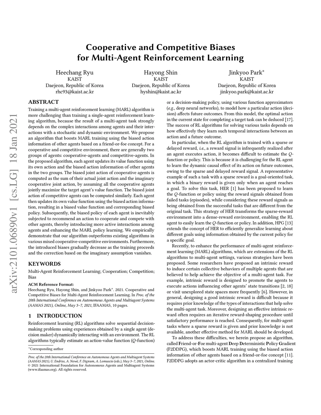 Training a multi-agent reinforcement learning (MARL) algorithm is more challenging than training a single-agent reinforcement learning algorithm, because the result of a multi-agent task strongly depends on the complex interactions among agents and their interactions with a stochastic and dynamic environment. We propose an algorithm that boosts MARL training using the biased action information of other agents based on a friend-or-foe concept. For a cooperative and competitive environment, there are generally two groups of agents: cooperative-agents and competitive-agents. In the proposed algorithm, each agent updates its value function using its own action and the biased action information of other agents in the two groups. The biased joint action of cooperative agents is computed as the sum of their actual joint action and the imaginary cooperative joint action, by assuming all the cooperative agents jointly maximize the target agent's value function. The biased joint action of competitive agents can be computed similarly. Each agent then updates its own value function using the biased action information, resulting in a biased value function and corresponding biased policy. Subsequently, the biased policy of each agent is inevitably subjected to recommend an action to cooperate and compete with other agents, thereby introducing more active interactions among agents and enhancing the MARL policy learning. We empirically demonstrate that our algorithm outperforms existing algorithms in various mixed cooperative-competitive environments. Furthermore, the introduced biases gradually decrease as the training proceeds and the correction based on the imaginary assumption vanishes.