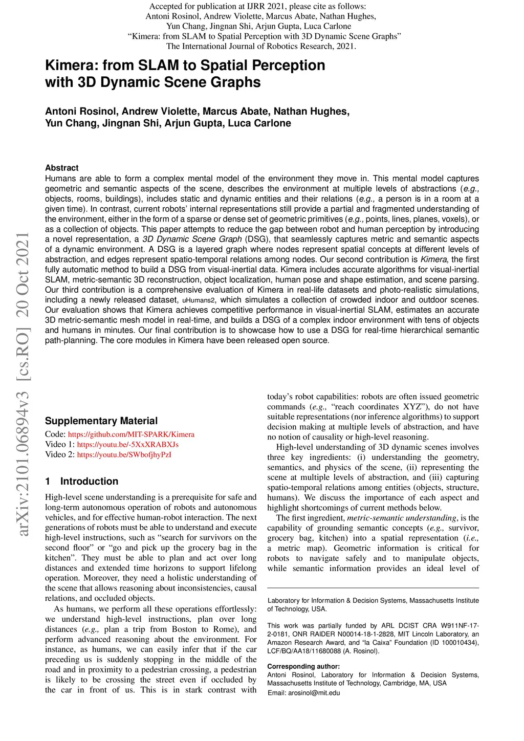 Kimera: from SLAM to Spatial Perception with 3D Dynamic Scene Graphs